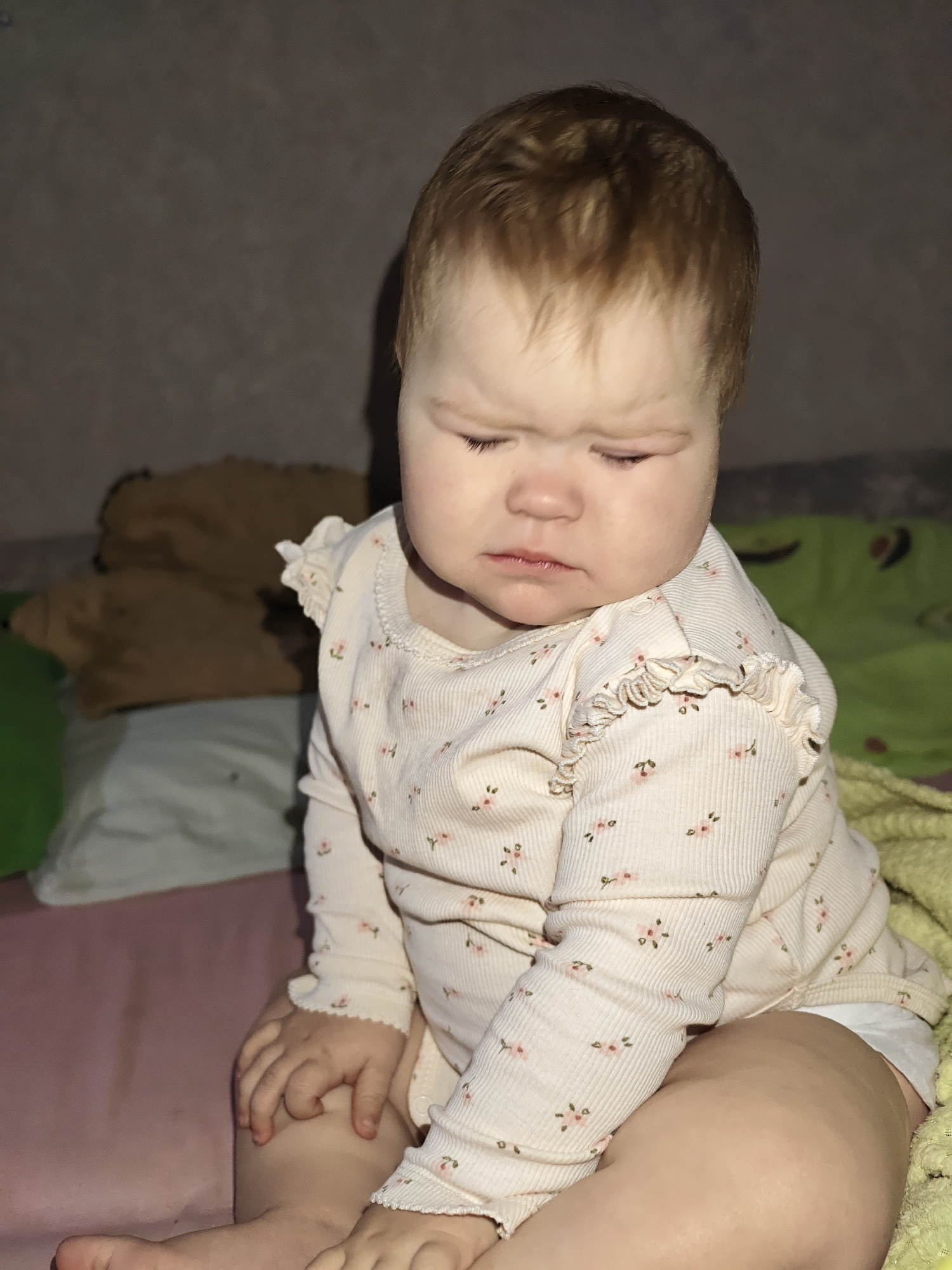 A baby with red hair is sitting indoors on a bed. The baby is wearing a long-sleeved, patterned shirt. The bed has a pink sheet and a green blanket. A brown stuffed animal is visible in the background…read more