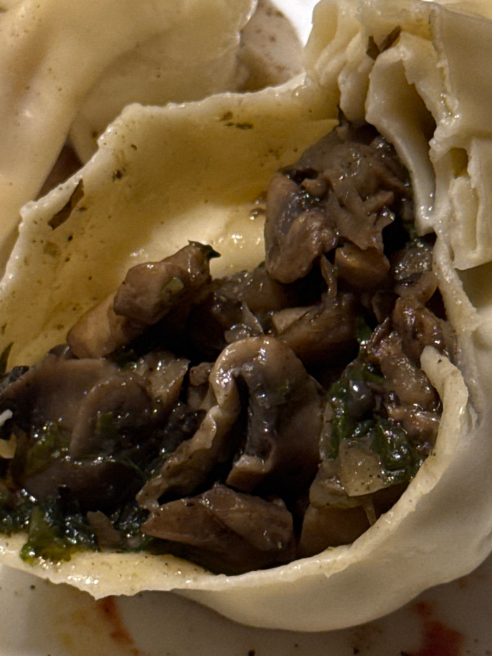 A close-up, top-down view depicts a partially opened dough parcel, characteristic of a Georgian khinkali. The off-white, pleated dough wrapper is torn to reveal its internal filling. The primary filli…read more