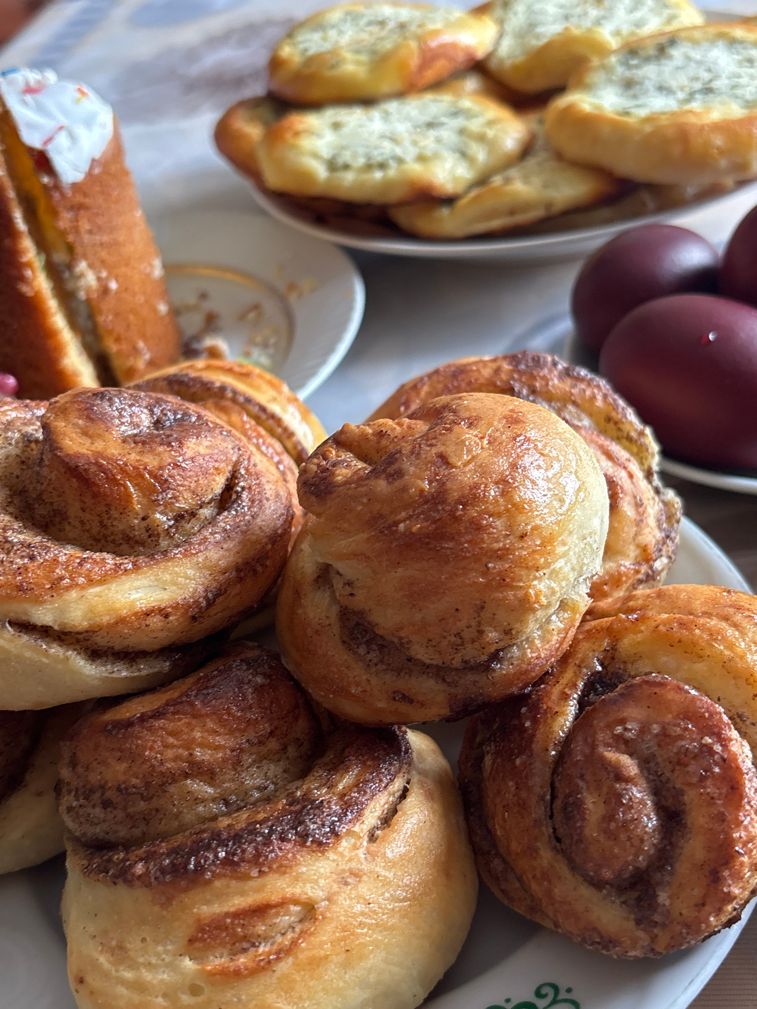 A close-up shot shows an assortment of baked goods arranged on a table. A dish containing small, oblong rolls with a greenish filling is on the left side. Next to it are several deep-red colored eggs.…read more