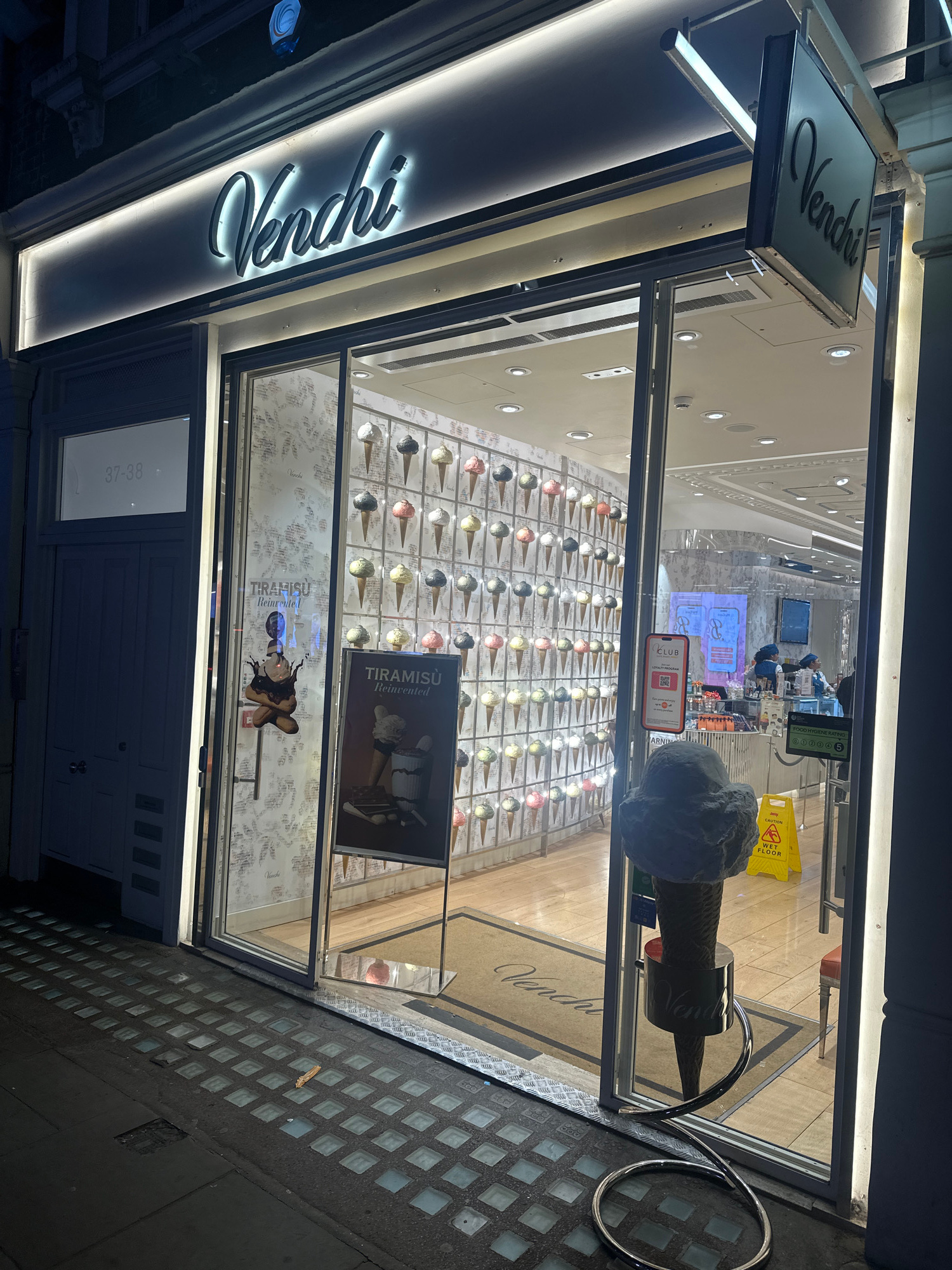 The image captures the illuminated storefront of a Venchi shop at night, likely in London, United Kingdom, given the provided context and visible cues. The scene is dark outside, emphasizing the brigh…read more