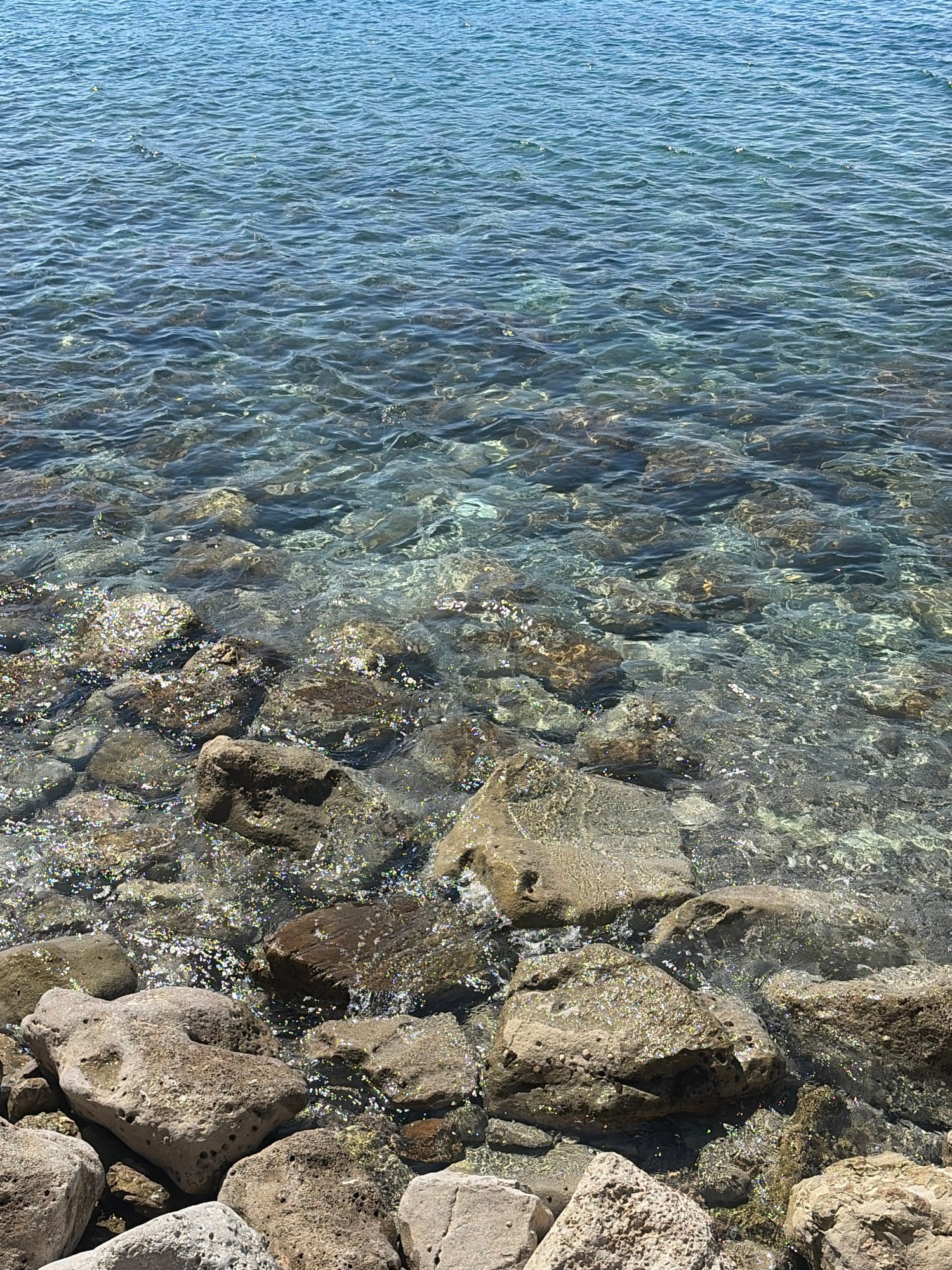 The image depicts the edge of the Adriatic Sea meeting the rocky shore in Budva, Montenegro. Clear, blue-tinged water washes over the rocks, its surface rippling with small waves. The rocks vary in si…read more