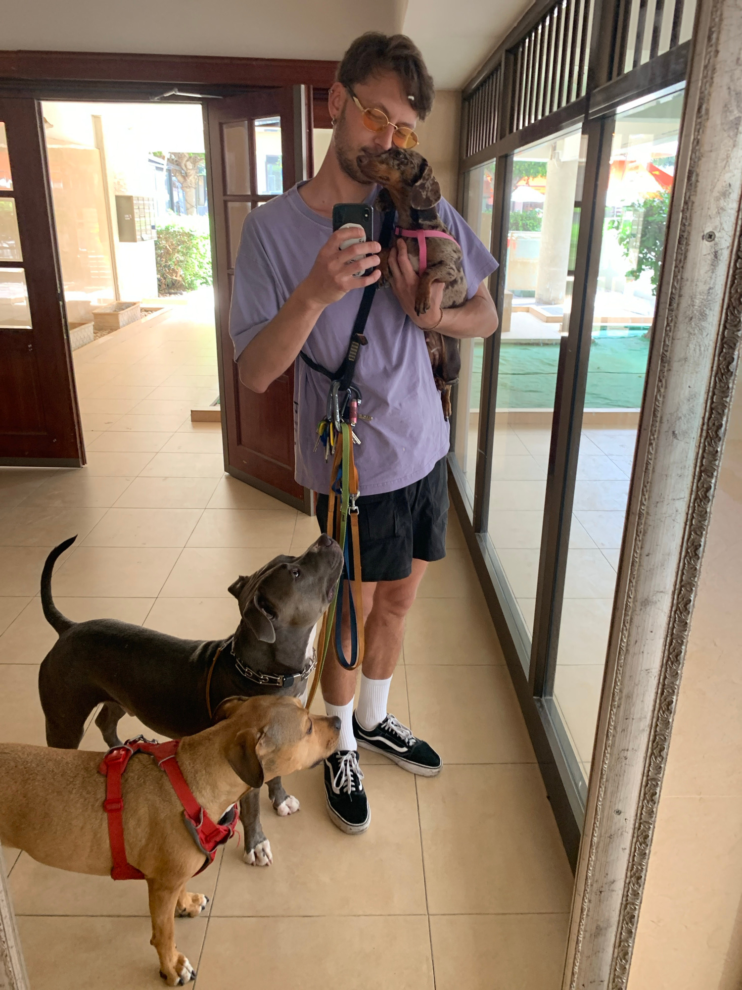 A medium-shot, indoor, and mirrored image shows a man and his four dogs. The man, fair-skinned with short brown hair, wears orange-tinted sunglasses, a light purple short-sleeved shirt, and black shor…read more