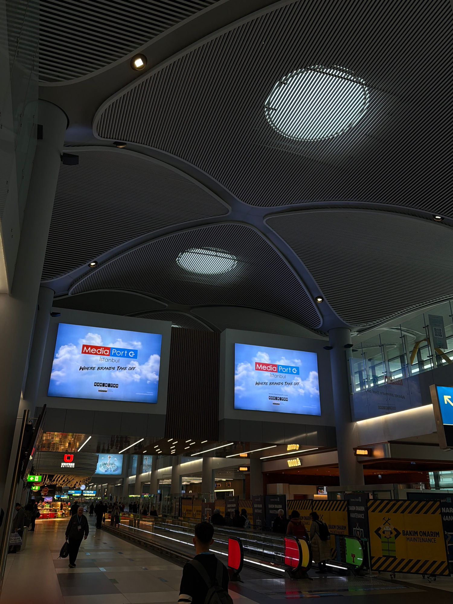 This image shows the interior of Istanbul Airport (IST) in Arnavutköy, Turkey. The architectural details include a high, patterned ceiling with circular light openings. The scene depicts an airport te…read more