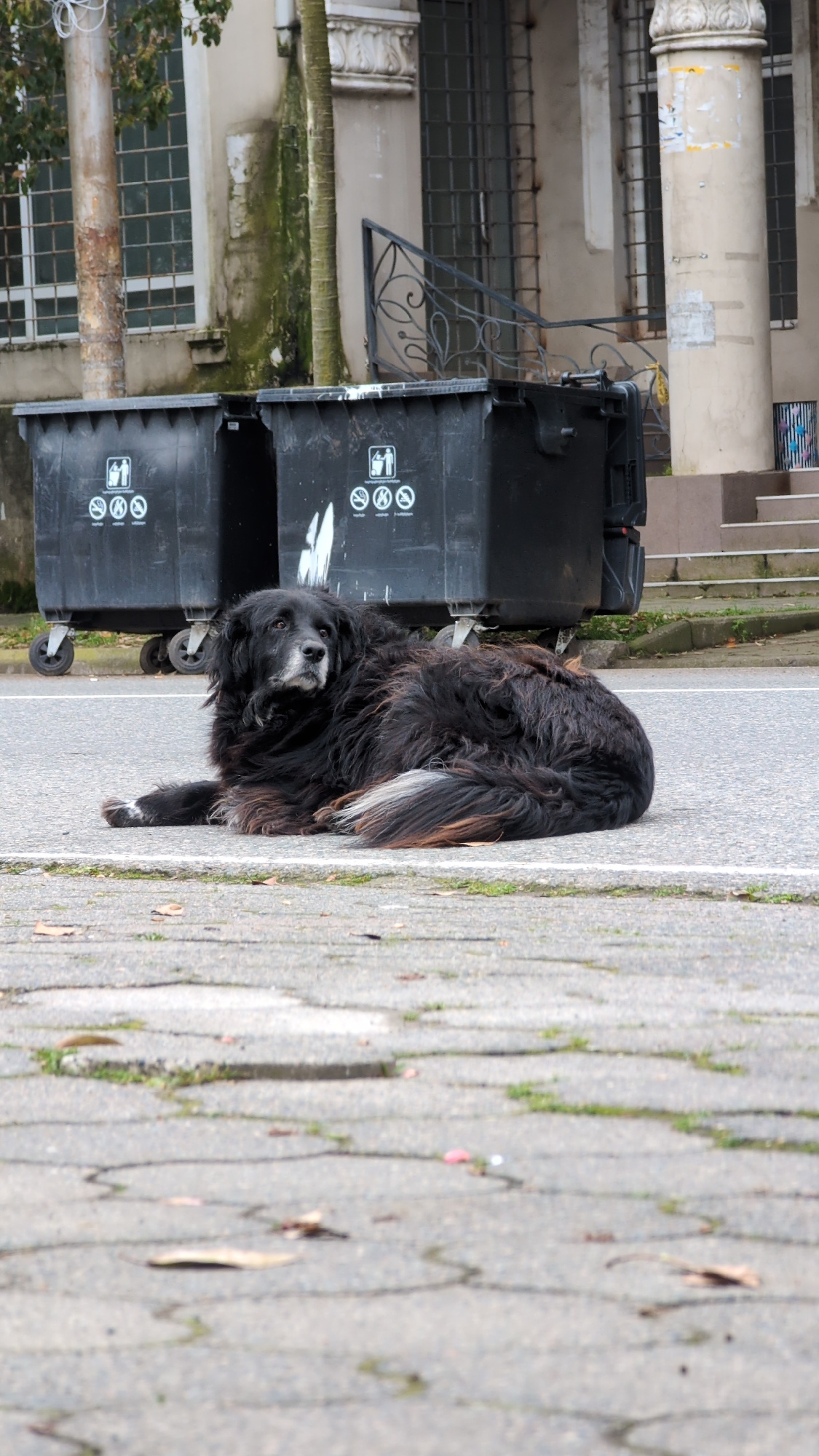 A long-haired, black dog rests on a gray concrete sidewalk next to black plastic refuse bins. The dog faces the viewer, with a white stripe near the tail and white paws. The bins are adjacent to a wal…read more