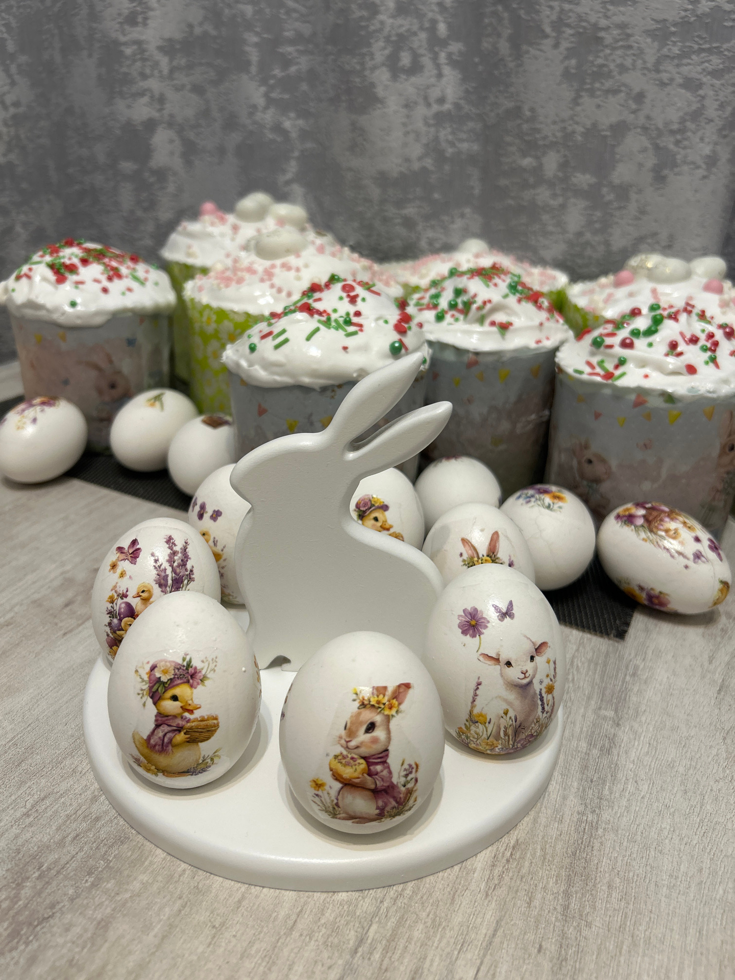The image features a tabletop Easter display with four Easter cakes (kulich) topped with white icing and colored sprinkles, positioned on the left side of the frame. To the right, there's a white plat…read more