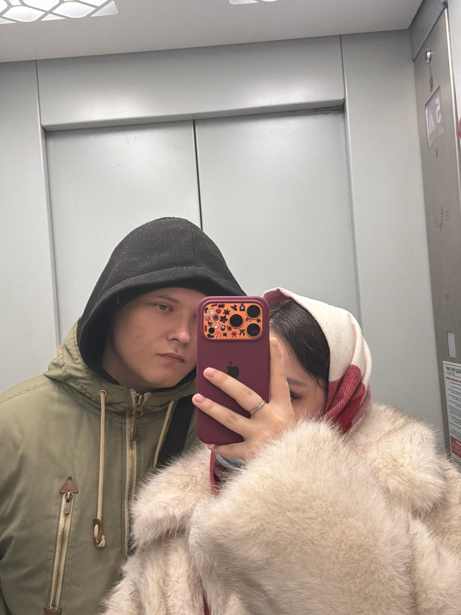 A couple is taking a selfie in what appears to be an elevator. The location is likely in Perm, Russia, as indicated by the elevator panel. The woman is wearing a white and red hat with a large, furry…read more