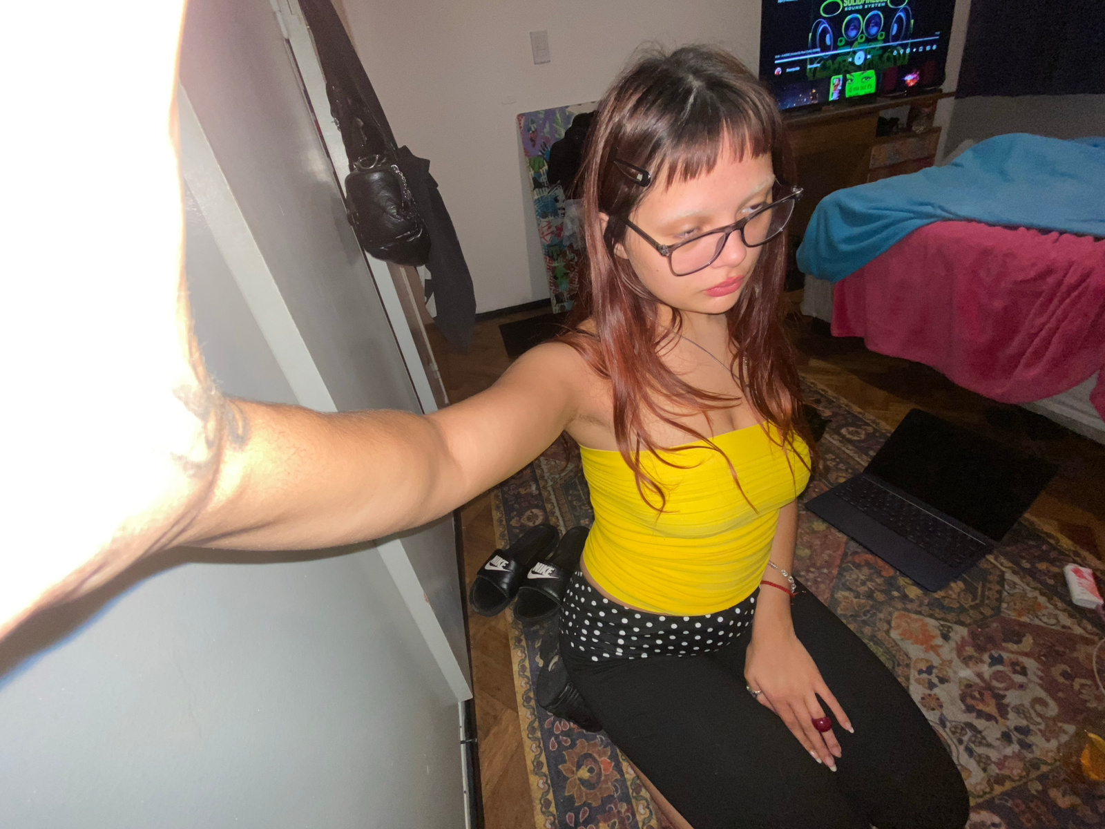 A person is lying on the floor taking a selfie. The person is wearing glasses, a yellow tank top, and black leggings with a polka dot waistband. They are surrounded by a patterned rug, a laptop, and a…read more
