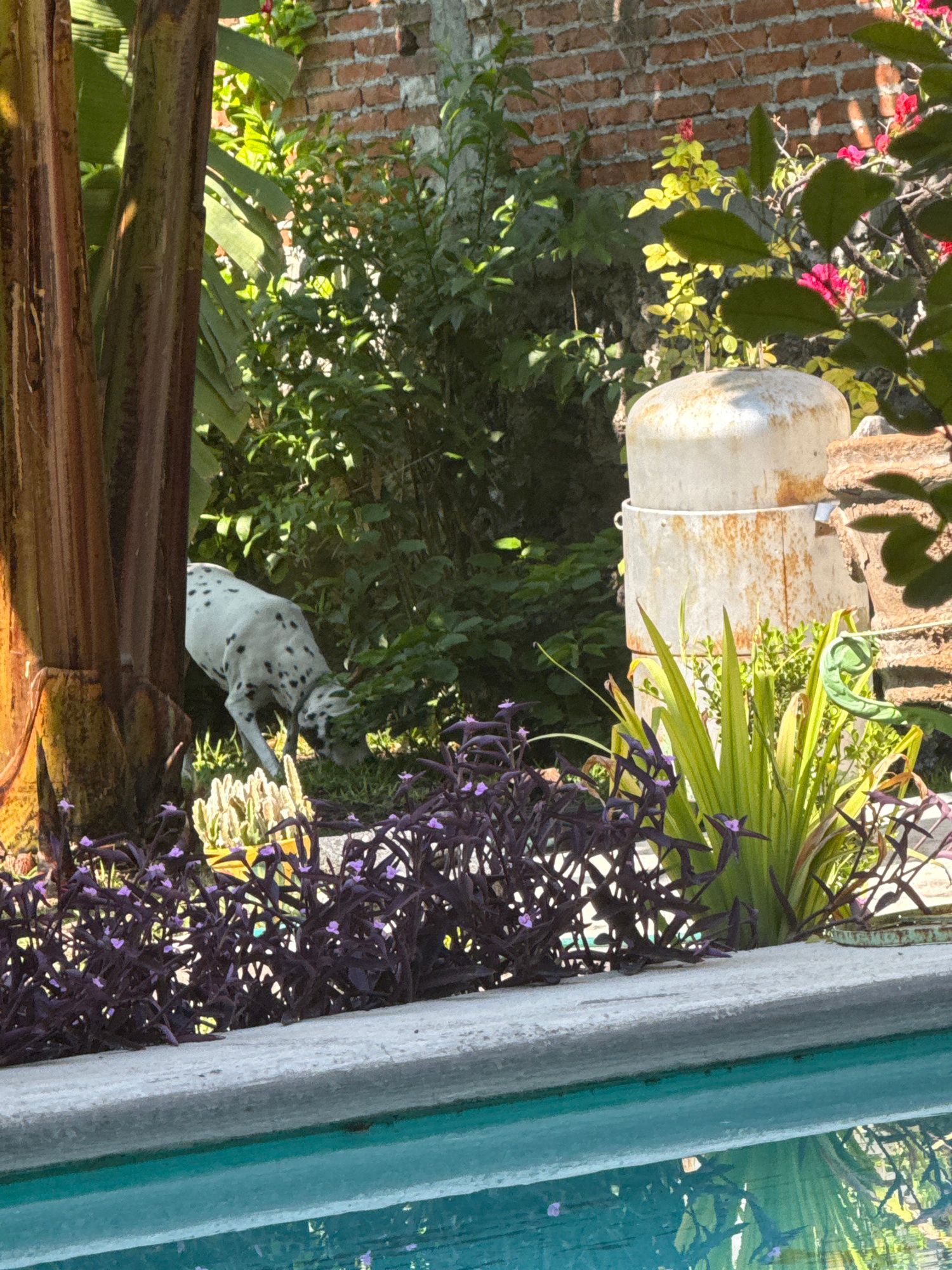 A Dalmatian dog is seen on a banana tree in a yard in Xochitepec, Mexico. The dog is standing on the tree trunk, its front paws resting on a cluster of succulent plants. The yard is filled with lush g…read more