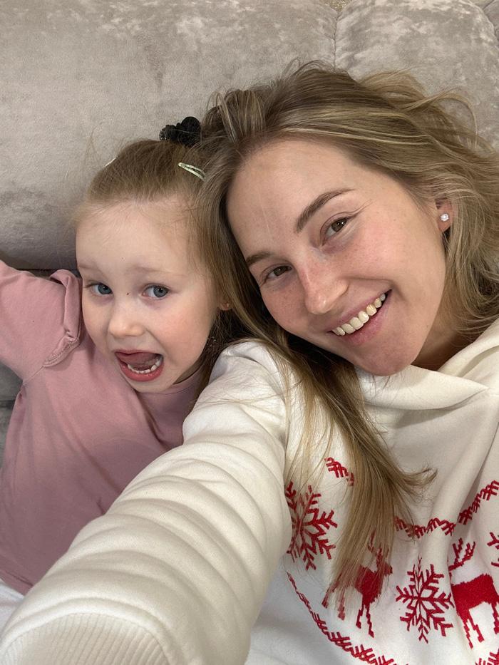 A woman and a young girl are lying on a couch. The woman has blonde hair, fair skin, and is wearing a white sweater with a red snowflake and reindeer pattern. She is smiling broadly, showing her teethβ¦read more