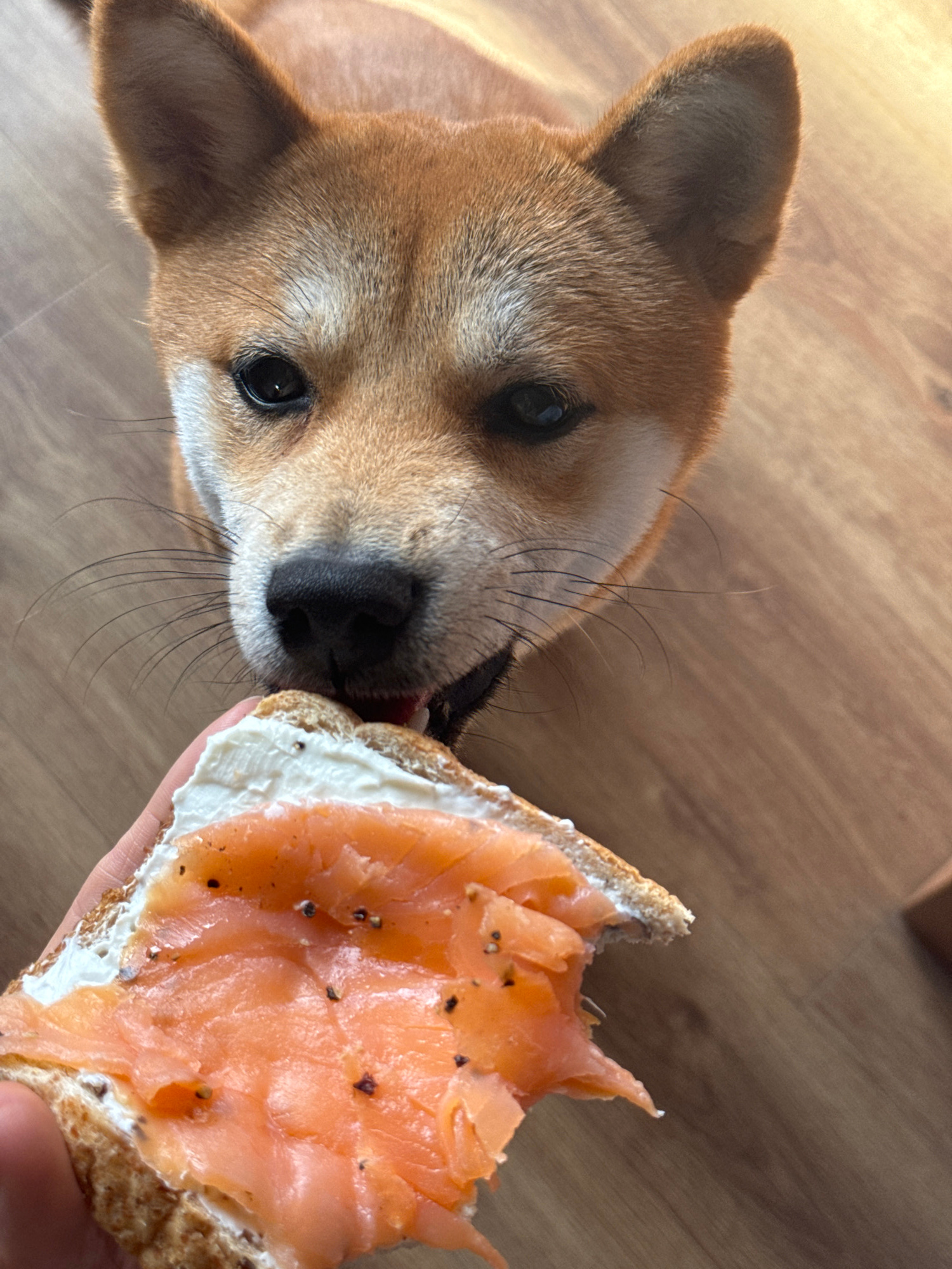 In Carnikava, Latvia, a close-up, high-angle view depicts a domestic scene. A light-skinned human hand, partially visible, holds a piece of brown bread topped with white cream cheese and multiple slic…read more