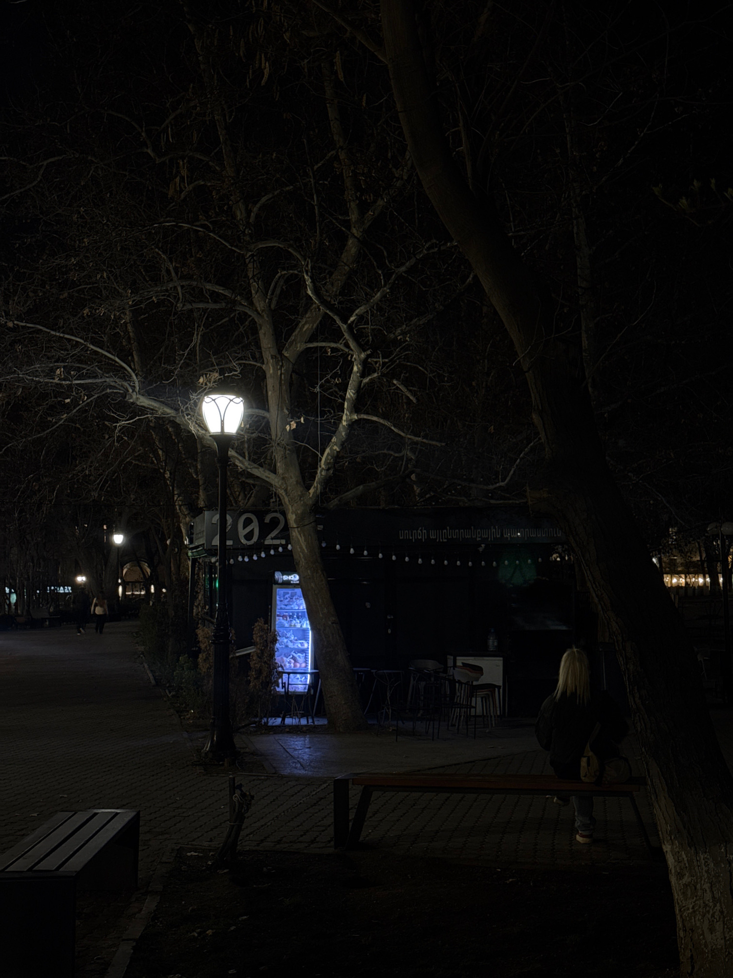 The image presents a nighttime scene in a pedestrian area or park within Yerevan, Armenia. A prominent, illuminated streetlamp with a decorative white fixture stands center-left, casting light on a pa…read more
