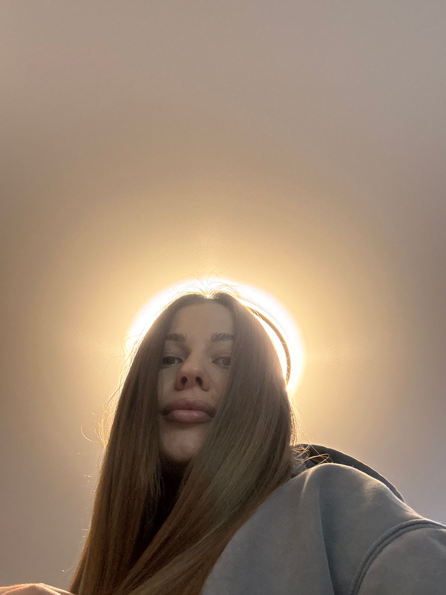A woman is positioned above and slightly to the right of the camera, looking down. The backdrop appears to be a light-colored, possibly beige or pale yellow, wall or ceiling. The sun is positioned dir…read more