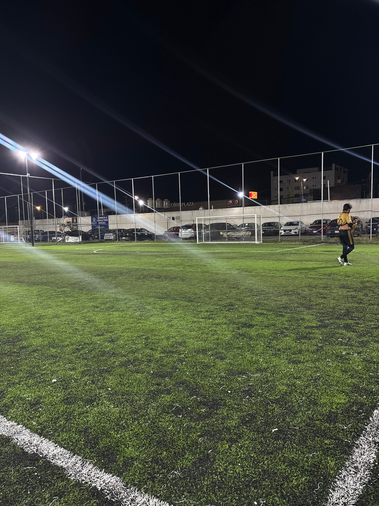 The image shows a brightly lit outdoor soccer field with artificial turf at night in San Bernardino Tlaxcalancingo, Mexico. A person in a black and gold soccer uniform is captured in motion on the fie…read more