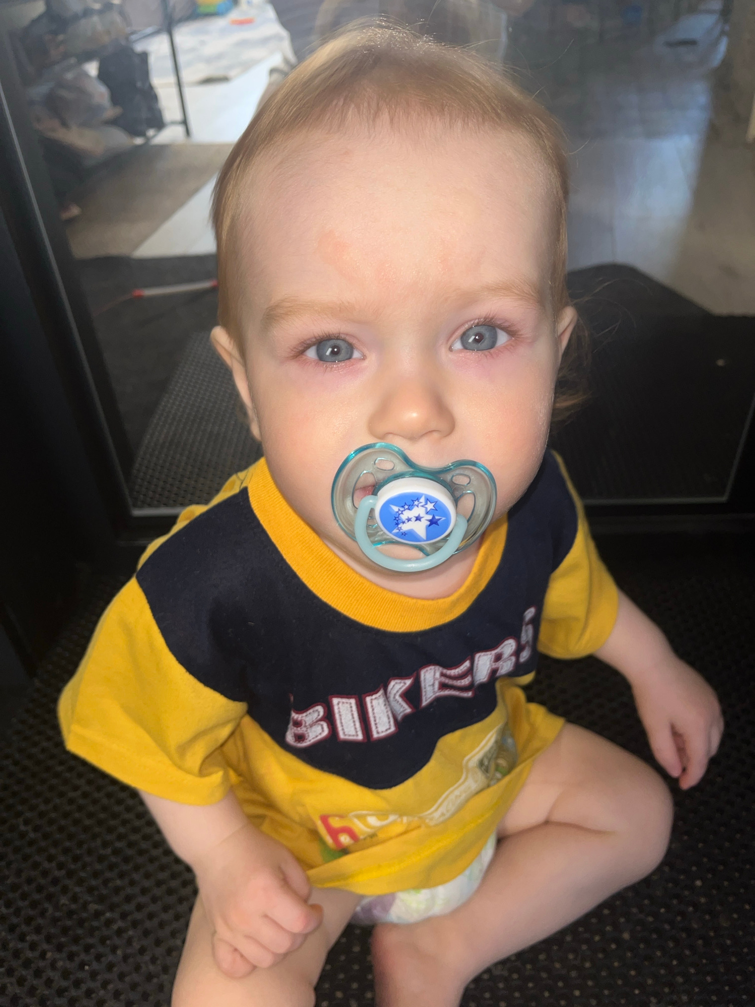 A close-up, high-angle shot depicts a baby lying on what appears to be a dark, textured surface. The baby has fair skin, blonde hair, and blue eyes, with a pacifier in their mouth. They are wearing a…read more