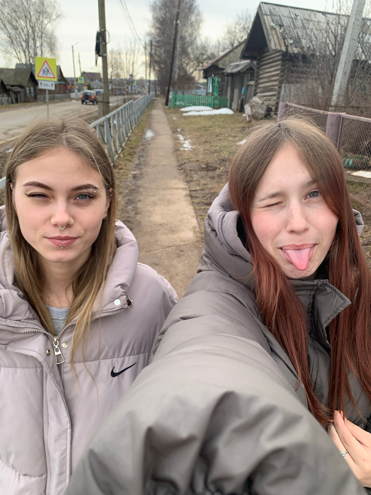 Two young women are posing closely for a selfie on a street in Фоки, Russia. Both are wearing winter jackets; one has long auburn hair and is sticking her tongue out while winking, while the other has…read more