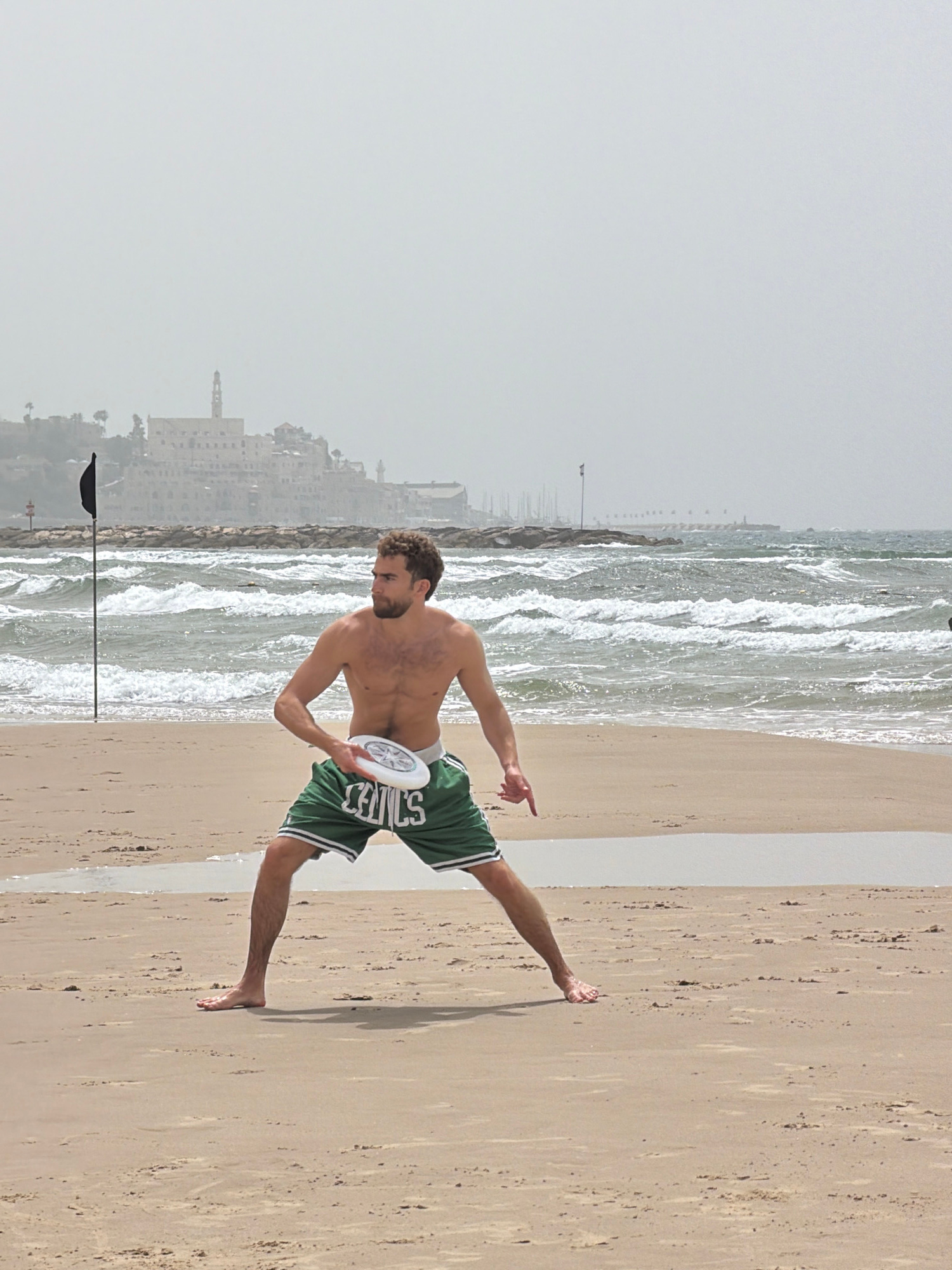 A man is seen on a sandy beach next to the Mediterranean Sea in Tel Aviv, Israel. The man is fair-skinned, shirtless, and wearing green shorts with "CELTICS" written on them. He is holding a white fri…read more