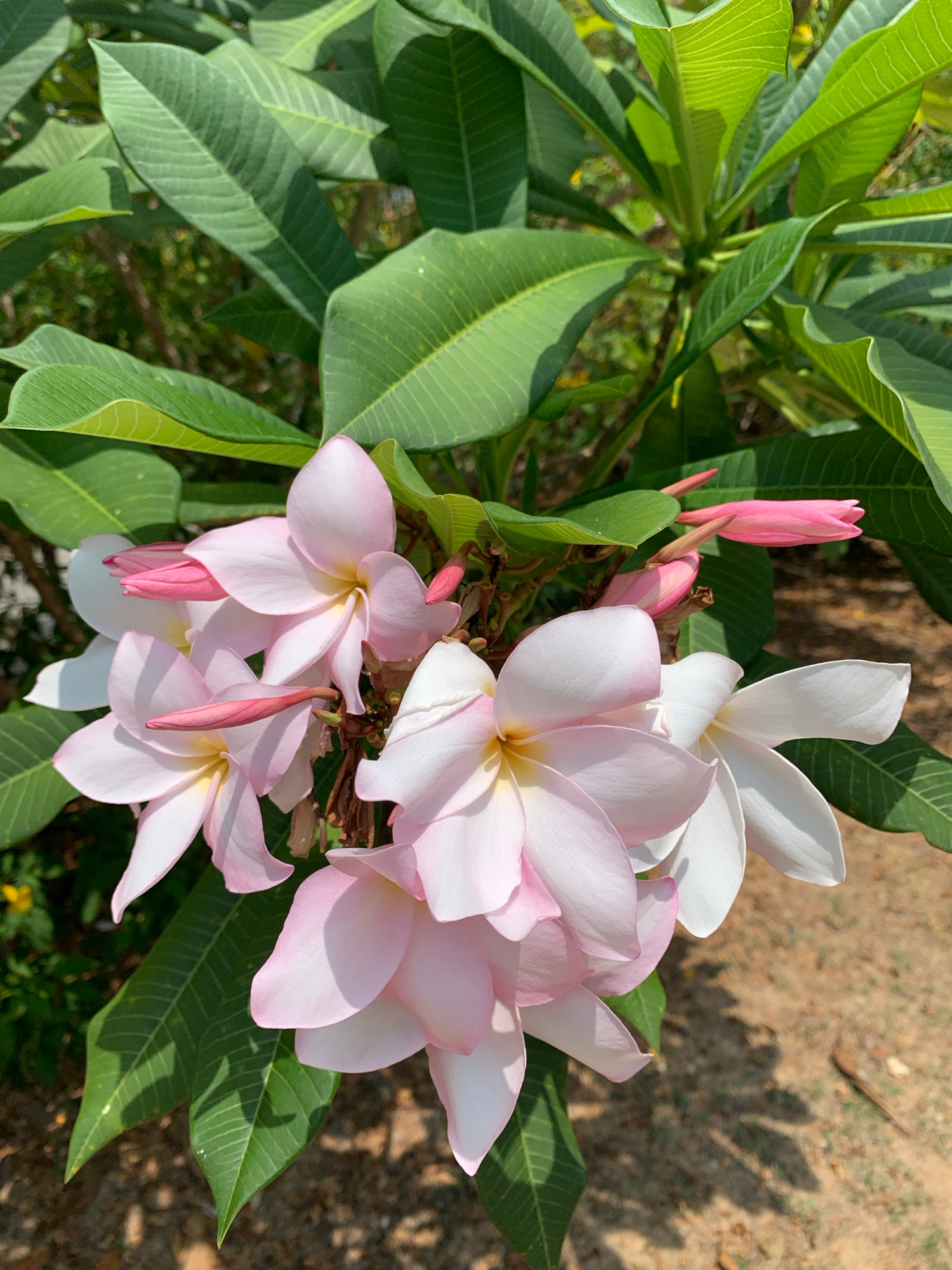 A close-up shot shows a cluster of plumeria flowers in varying shades of white and pink, some still in bud form. The flowers are positioned towards the right side of the frame. Green leaves with promi…read more