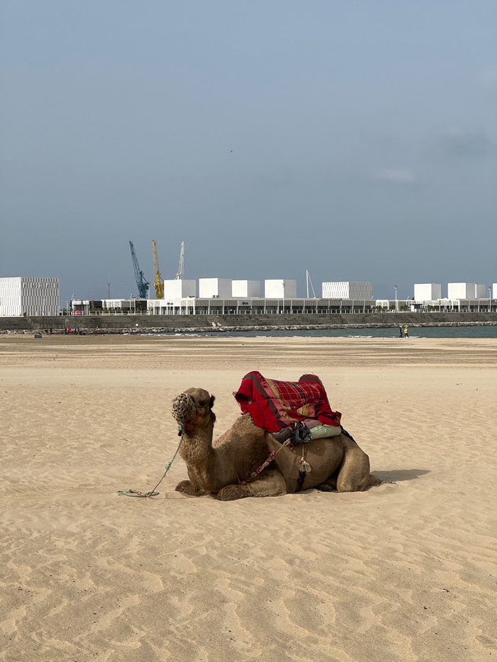 A light brown dromedary camel lies on a sandy beach in Tangier (Tanger), Morocco. The camel wears a dark muzzle and is outfitted with a red patterned saddle cloth over its hump, secured by ropes and a…read more