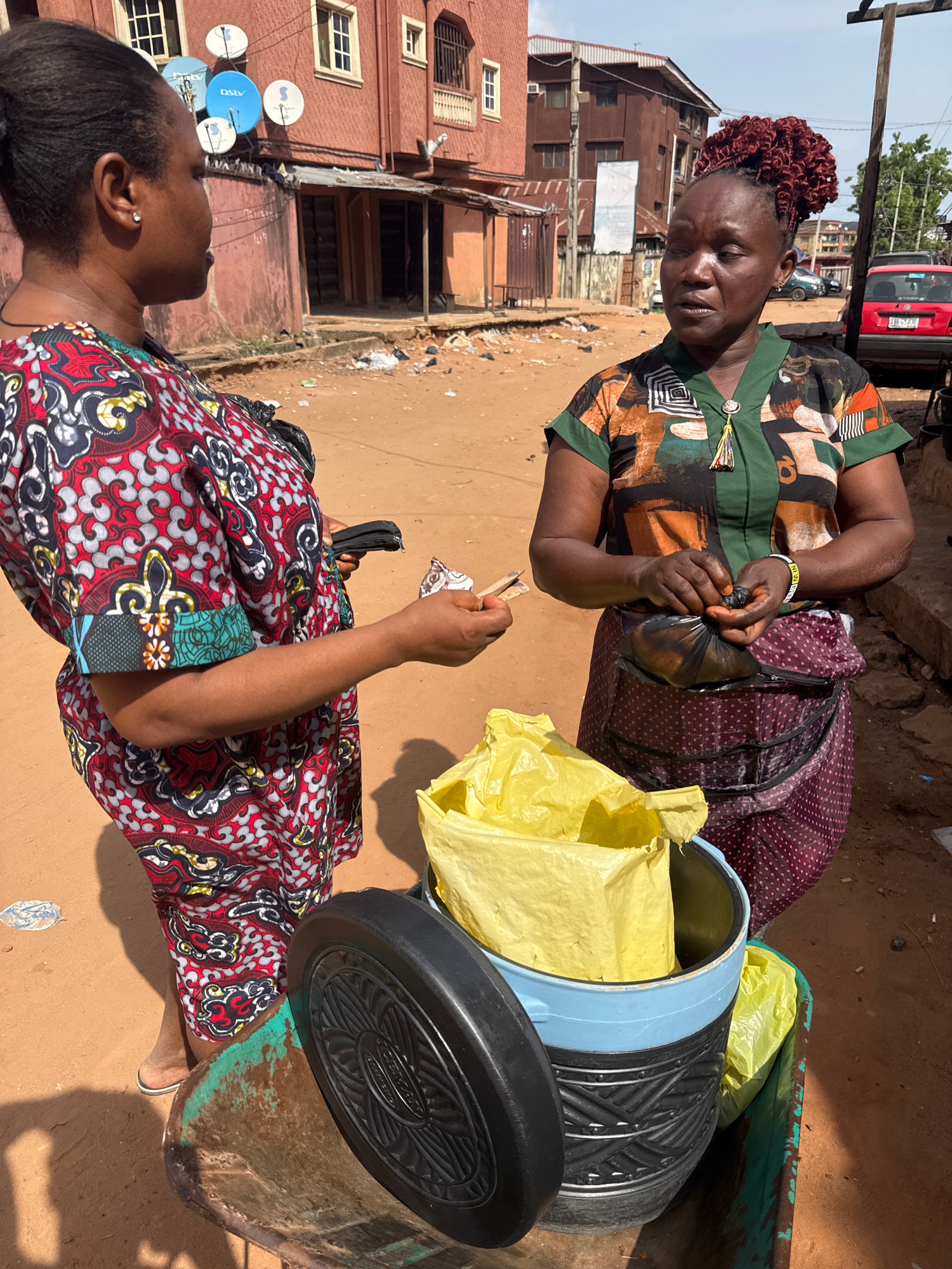 This image captures a vibrant street scene in Onitsha, Nigeria, showing a transaction between two women under clear daylight. The primary subjects are two women. The woman in the upper part of the fr…read more