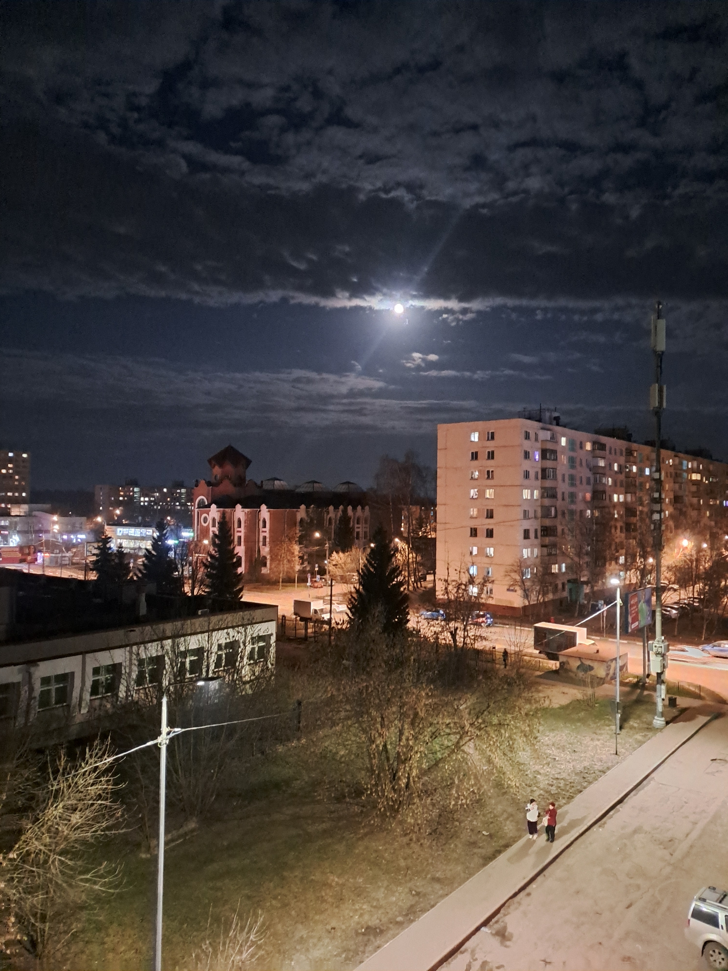 The image shows an urban night scene in Elektrostal, Russia. A bright full moon is visible in a sky partially obscured by clouds. Below, a tall, rectangular apartment building with numerous illuminate…read more
