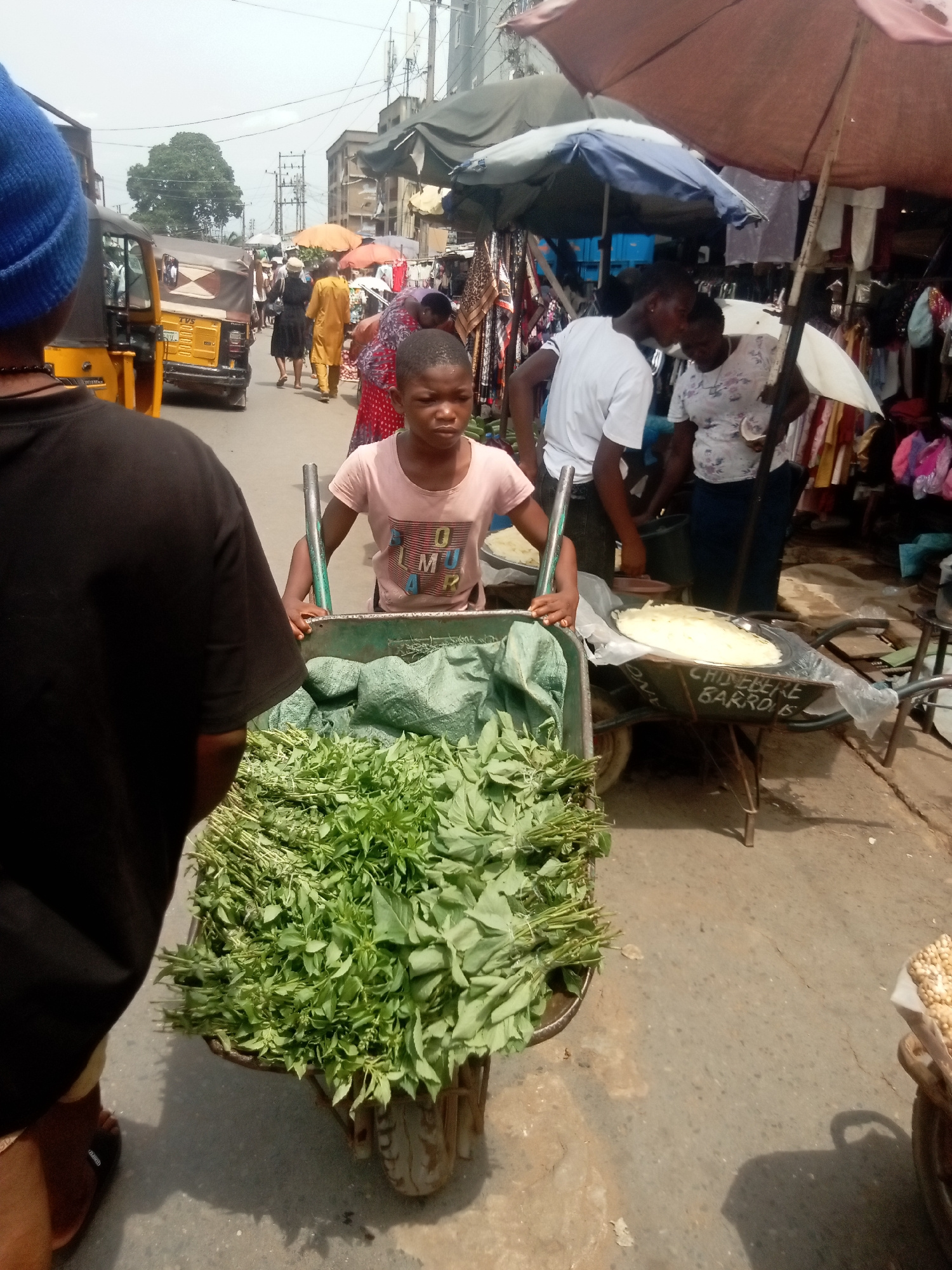 A young person is pushing a wheelbarrow full of leafy green vegetables through a bustling street market in Onitsha, Nigeria. Another wheelbarrow nearby holds a large, flat, white item possibly food. P…read more