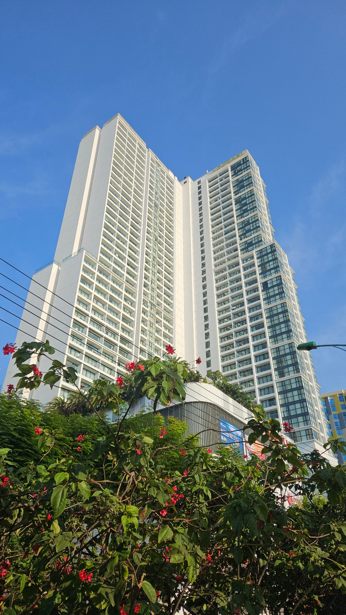 A low-angle shot of a tall, modern, white building in Nha Trang, Vietnam. The building is divided into two sections. The lower section is primarily white with a grid pattern of windows, while the uppe…read more