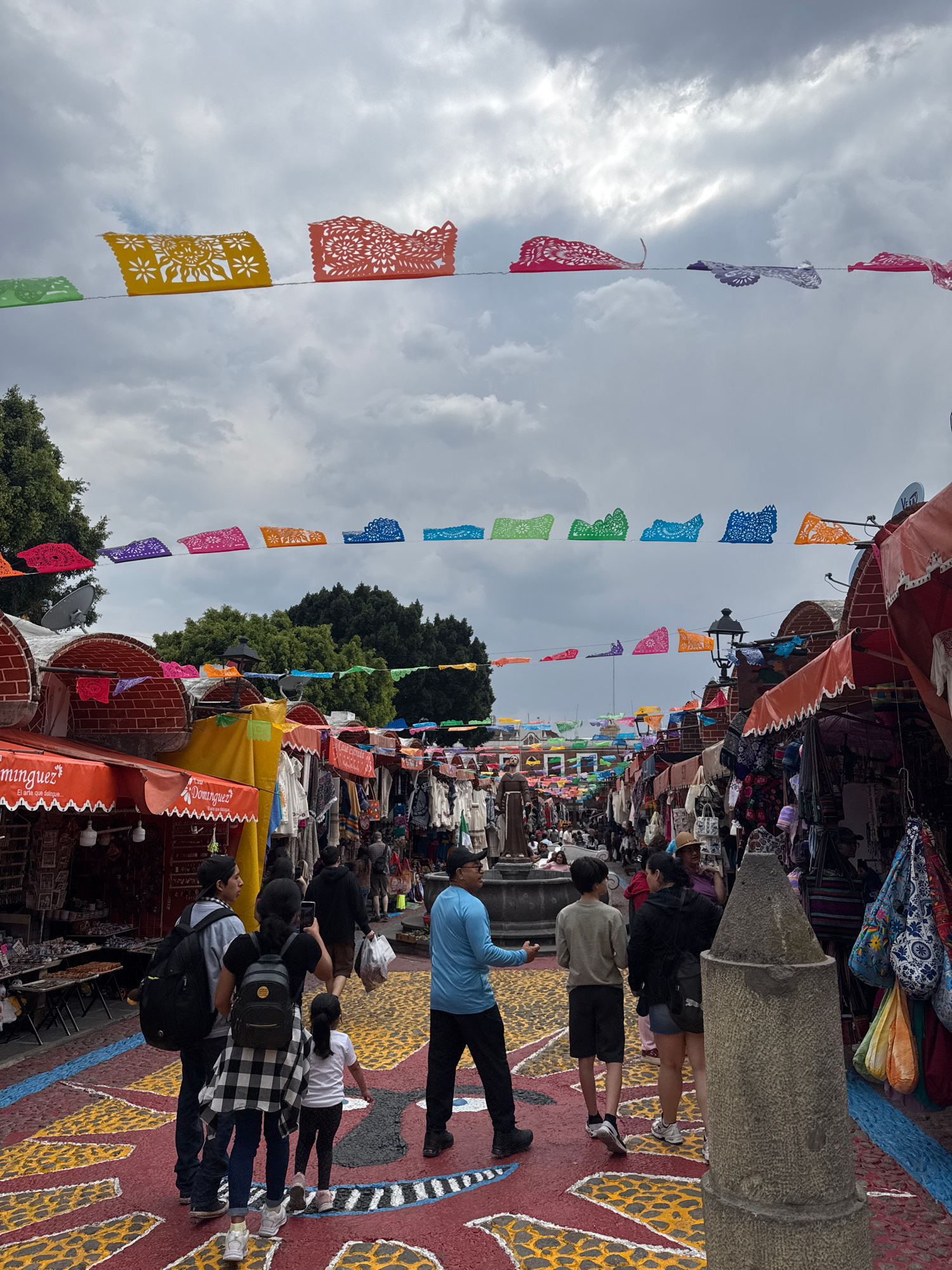 The image captures a street scene in Puebla, Mexico, bustling with people walking along a decorated street. Colorful papel picado banners hang overhead, stretching across the street between market sta…read more
