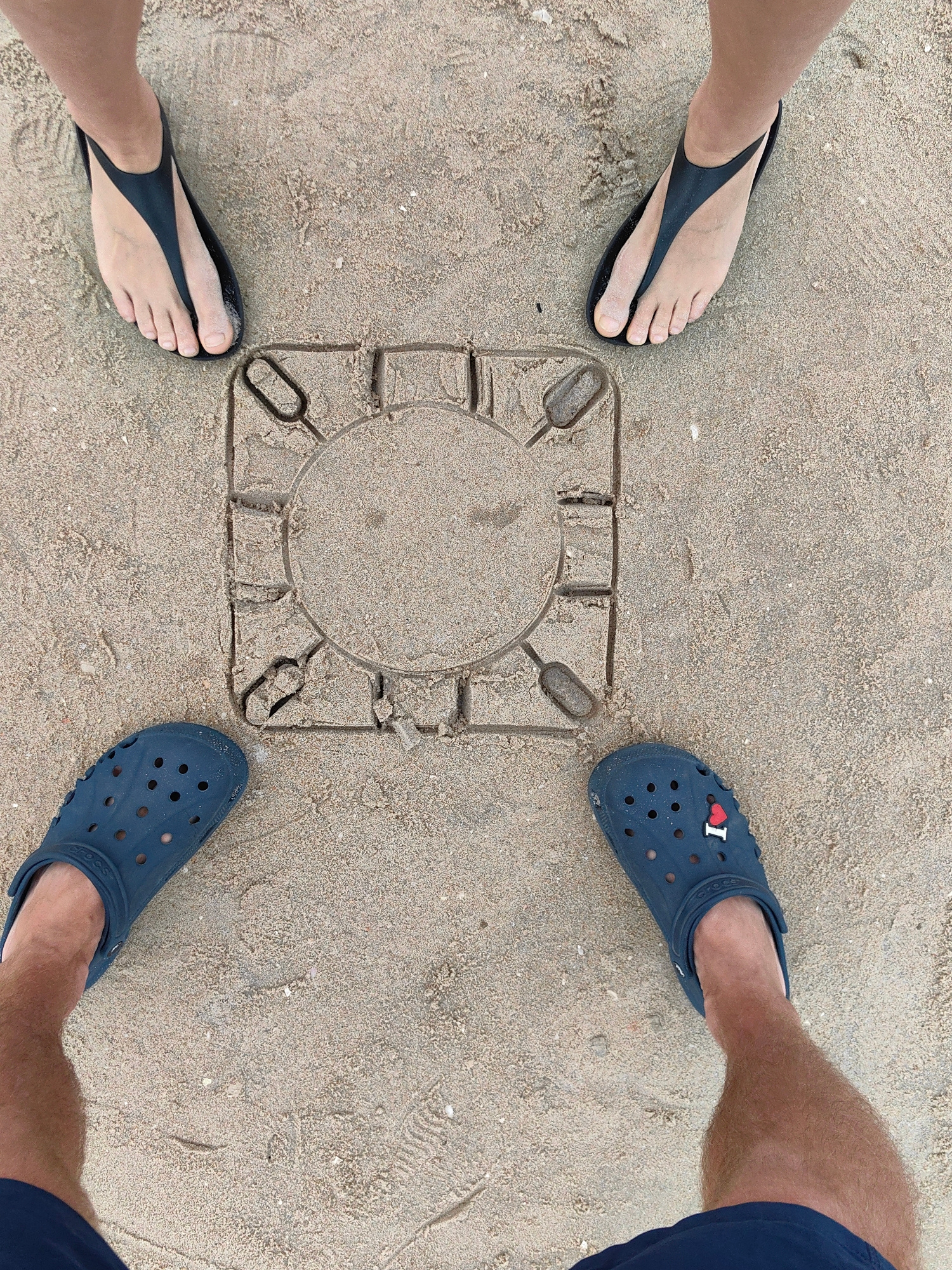 An overhead shot captures two pairs of human feet standing on light-colored sand in Bai Chay Ward, Vietnam. In the upper part of the frame, a person with fair skin wears black, minimalist flip-flops,…read more