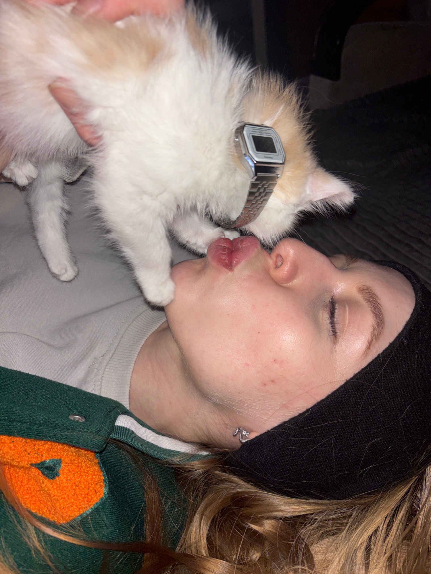 A fair-skinned woman with a black headband is shown in a close-up view kissing a white and tan kitten. The woman's eyes are closed and her lips are pursed. The kitten is wearing a silver Casio wristwa…read more