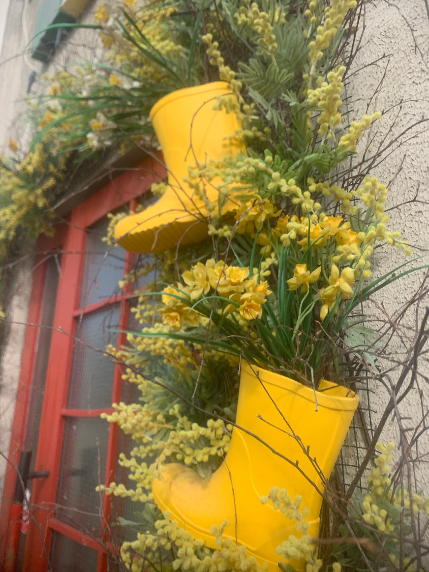 The image shows a close-up of a decorative arrangement featuring two bright yellow rain boots. The boots are positioned as if they are overflowing with various types of yellow flowers and greenery, in…read more