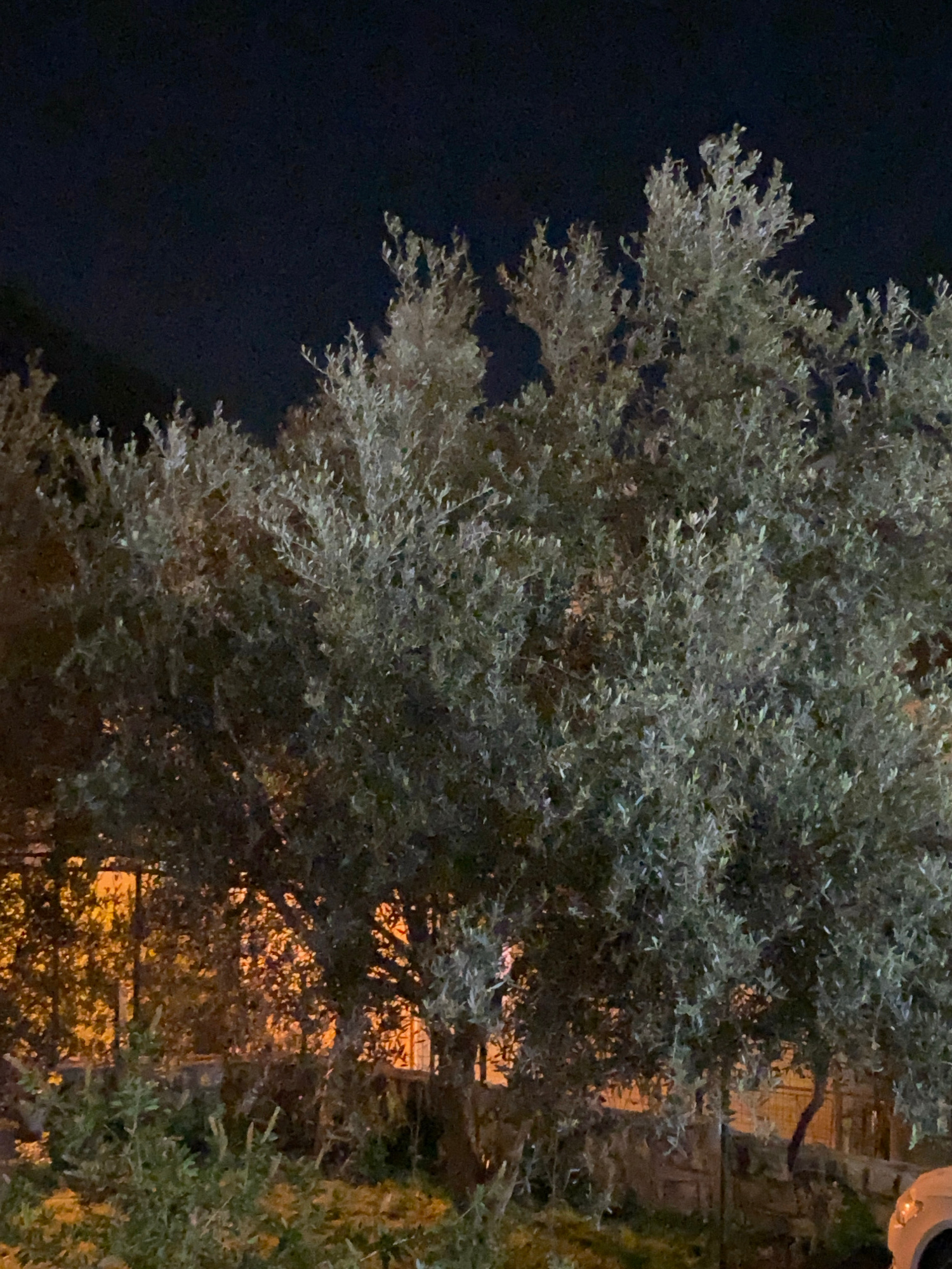 A dimly lit nighttime photograph shows a leafy tree against a dark sky. The tree's leaves are dense and light in color. Through the branches, there is the blurred glow of lights from buildings, sugges…read more