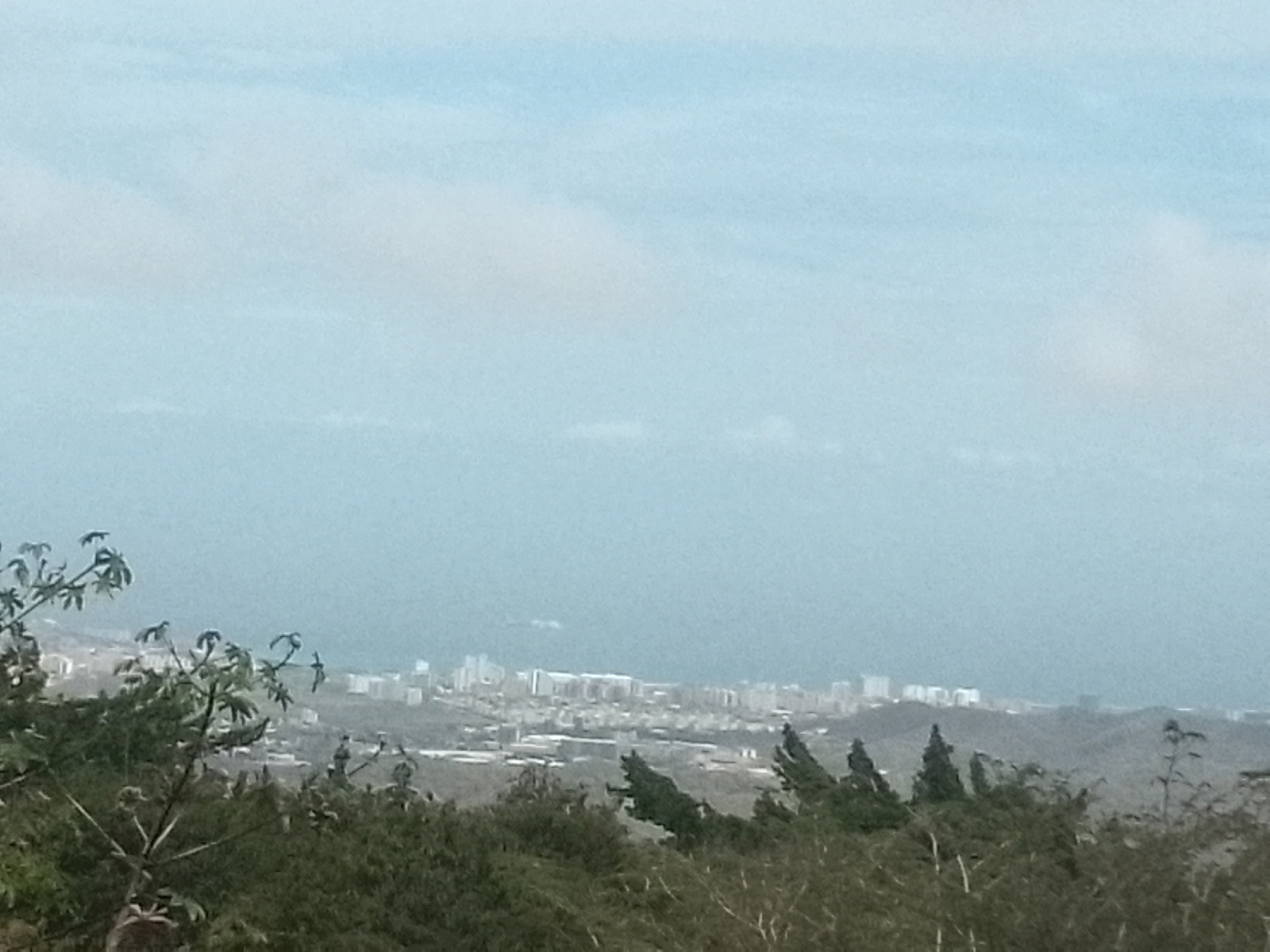 The image shows a distant view of a city skyline, possibly Las Piedras, Venezuela, seen from an elevated position with vegetation in the foreground. The sky is overcast. There are no people visible in…read more