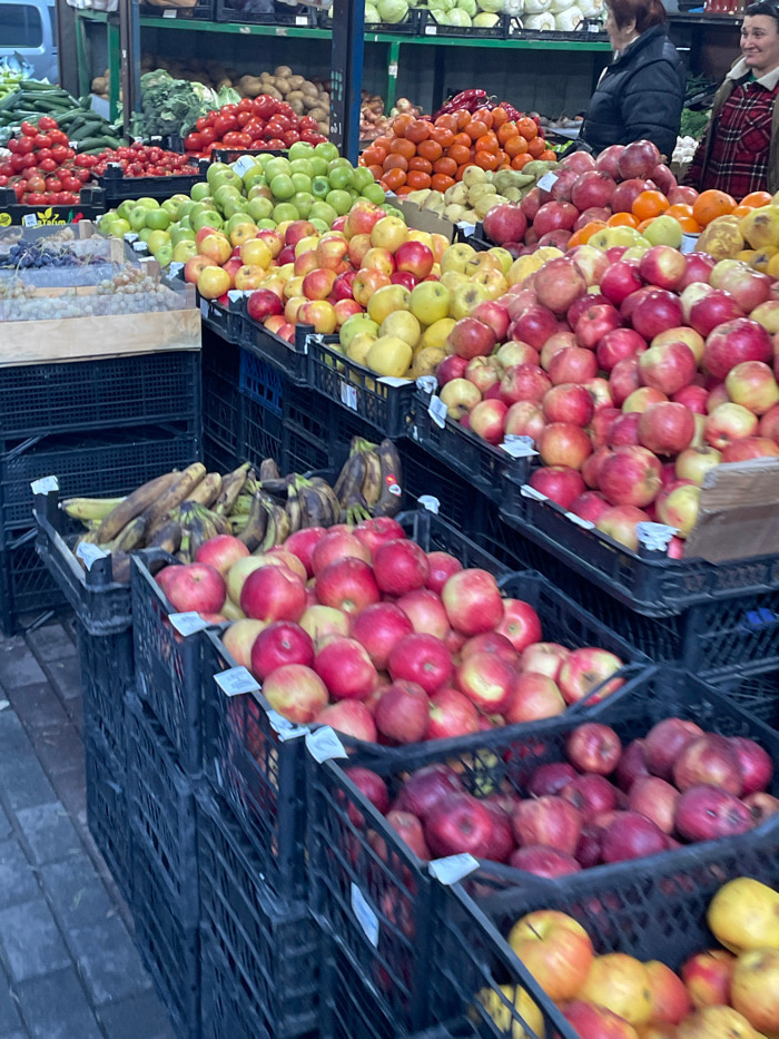 This image depicts a fruit and vegetable stall within a market in Batumi, Georgia. The scene is dominated by a diverse array of produce displayed in black plastic crates. In the foreground and midgro…read more