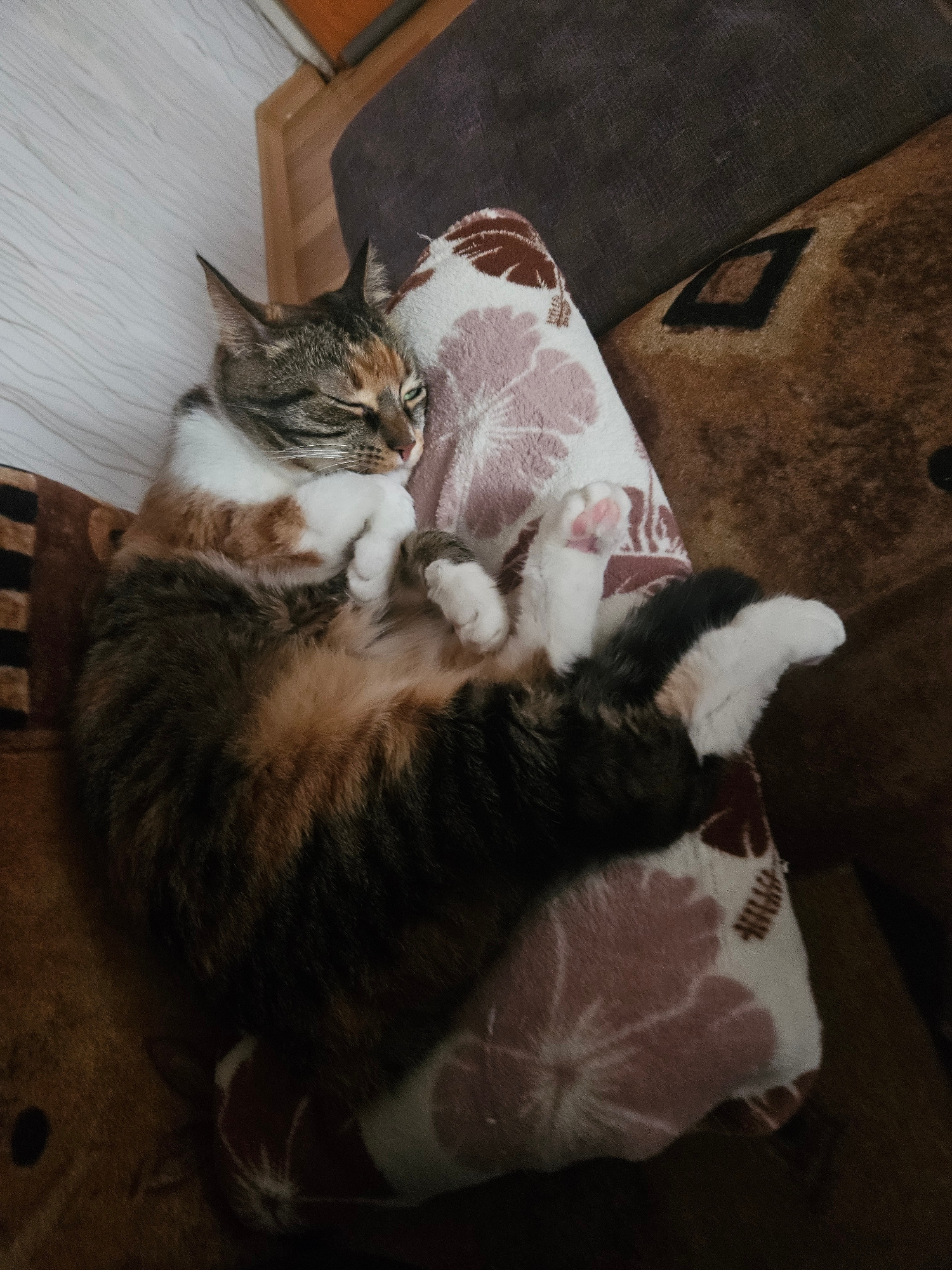A domestic cat with calico or tortoiseshell fur, featuring patches of white, brown, and dark grey/black, is shown resting indoors. The cat is lying on its back or side, curled up on a soft, patterned…read more