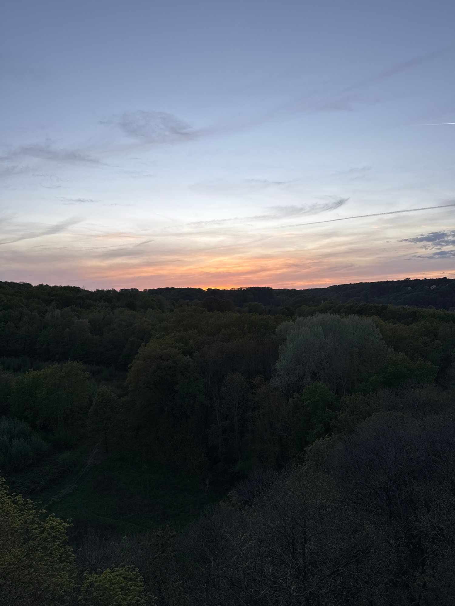 This image depicts a serene natural landscape at either sunrise or sunset, showcasing a vast expanse of sky and a dense forest. The sky, occupying the upper two-thirds of the frame, transitions from a…read more