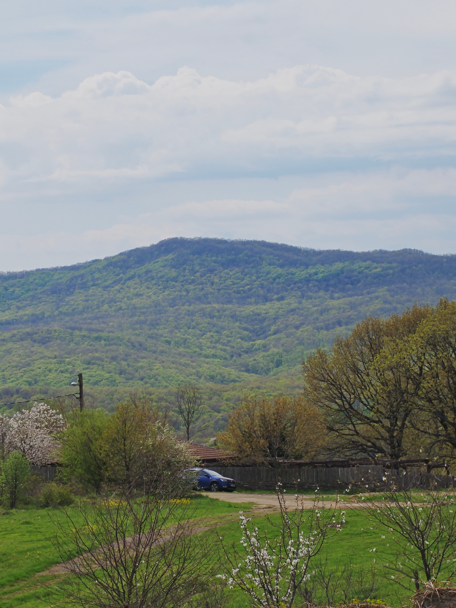 The image captures a landscape in Izgrev, Bulgaria. In the foreground, there's a grassy field with sparse, budding trees bearing white flowers. A dirt path cuts through the field. Beyond the field, a…read more