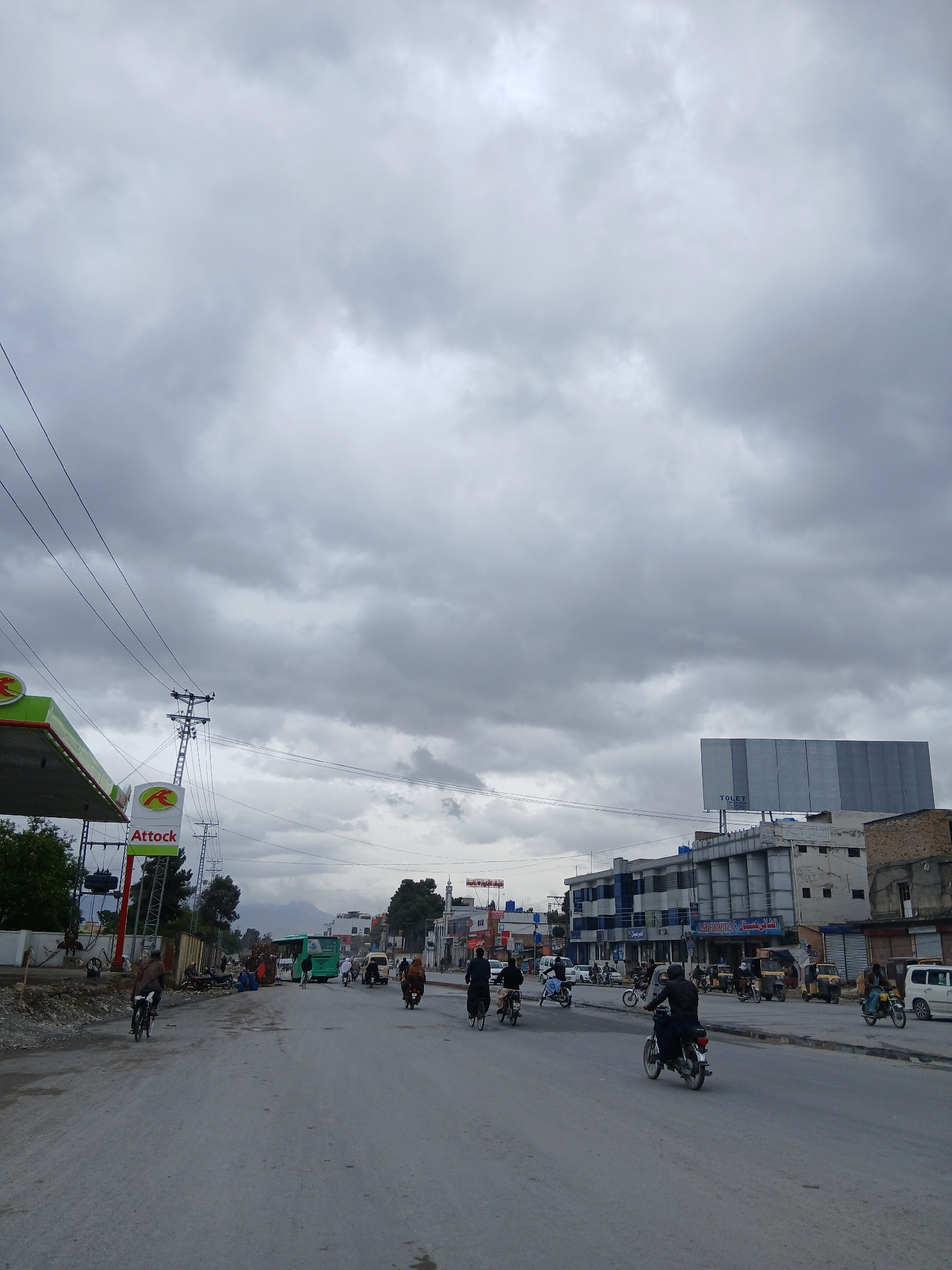 The image shows a street scene in Quetta City Tehsil, Pakistan, under a cloudy sky. A petrol station with an "Attock" logo is visible on the lower left. The street is lined with buildings of varying h…read more