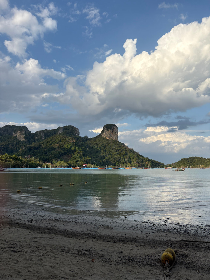 The image displays a coastal landscape in Ban Ao Nang, Thailand, under a partly cloudy sky. The upper section features a blue sky with extensive cumulus clouds, varying from white to shadowed grey. A…read more
