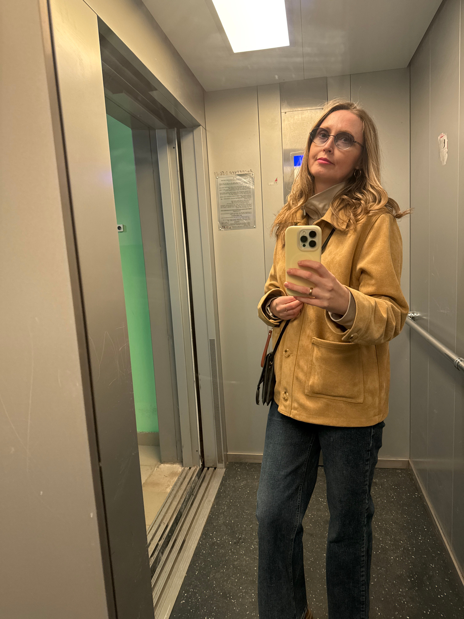 A woman is taking a selfie in what appears to be an elevator. She is wearing glasses, a tan jacket, and dark jeans. She is holding a phone in her right hand. The elevator has gray walls, a mirrored su…read more