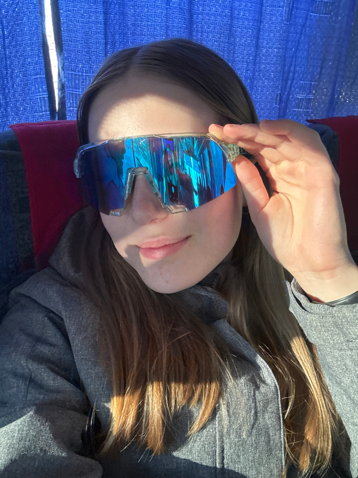 A person is wearing futuristic, reflective blue sunglasses, partially obscured by their right hand which is positioned to adjust the eyewear. The person has long blonde hair and is wearing a gray hood…read more