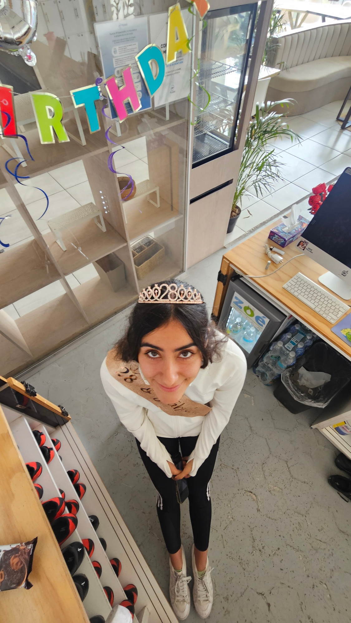 A young woman is seated on the floor in a commercial or retail setting. The woman has dark hair and is wearing a tiara and a birthday sash that reads "28 & Fabulous". She is wearing a white long-sleevβ¦read more
