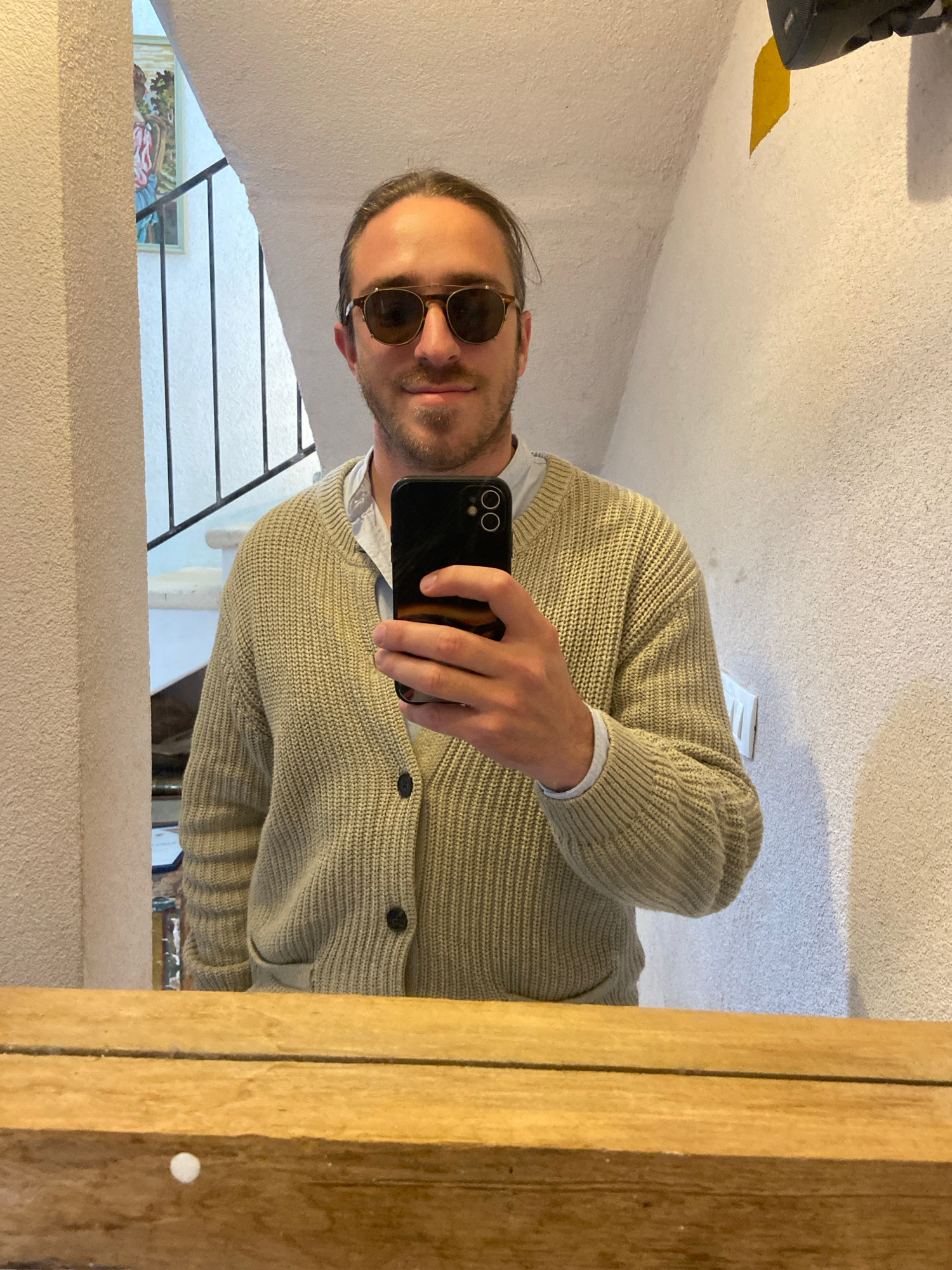 A man in sunglasses takes a mirror selfie. He is wearing a light-colored knit cardigan and a white collared shirt. He holds a black smartphone. Behind him are stairs with a black metal railing and a pā¦read more