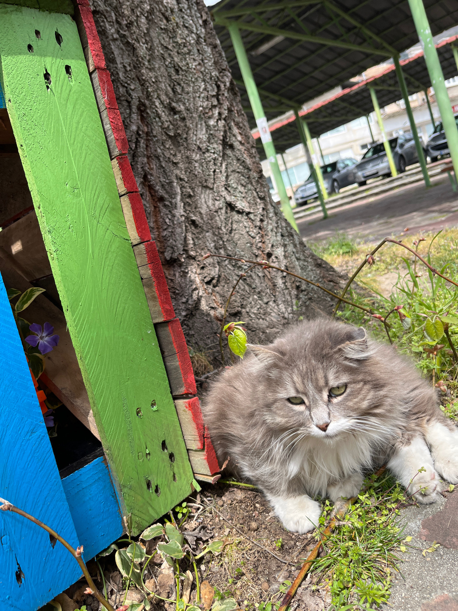 A medium-angle shot, taken outdoors, depicts a fluffy grey cat lying beside a tree stump. The cat has green eyes and white paws. A structure made of painted planks is beside the stump, with sections p…read more