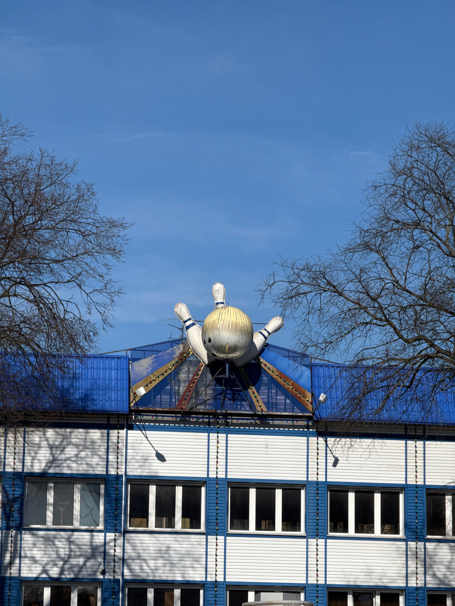 The image shows the roof of a building with a large bowling pin and ball sculpture on top of it. The building has a blue roof and white walls with blue trim and is located in an unknown city. The sky…read more