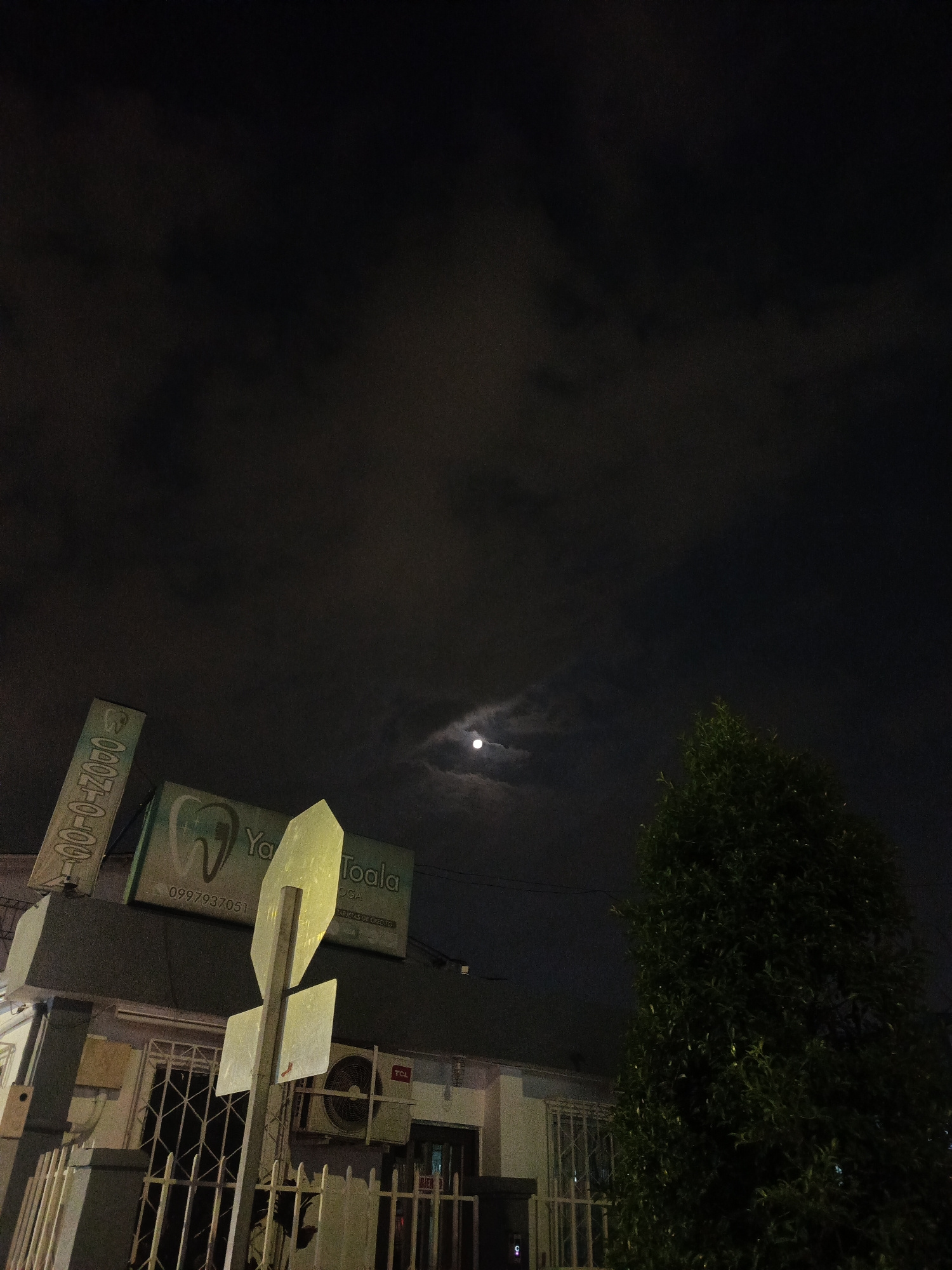 The image depicts a night scene in what appears to be a residential area in Guayaquil, Ecuador. The sky is overcast with dark clouds and a faintly visible moon. A tree stands to the right. In the lowe…read more