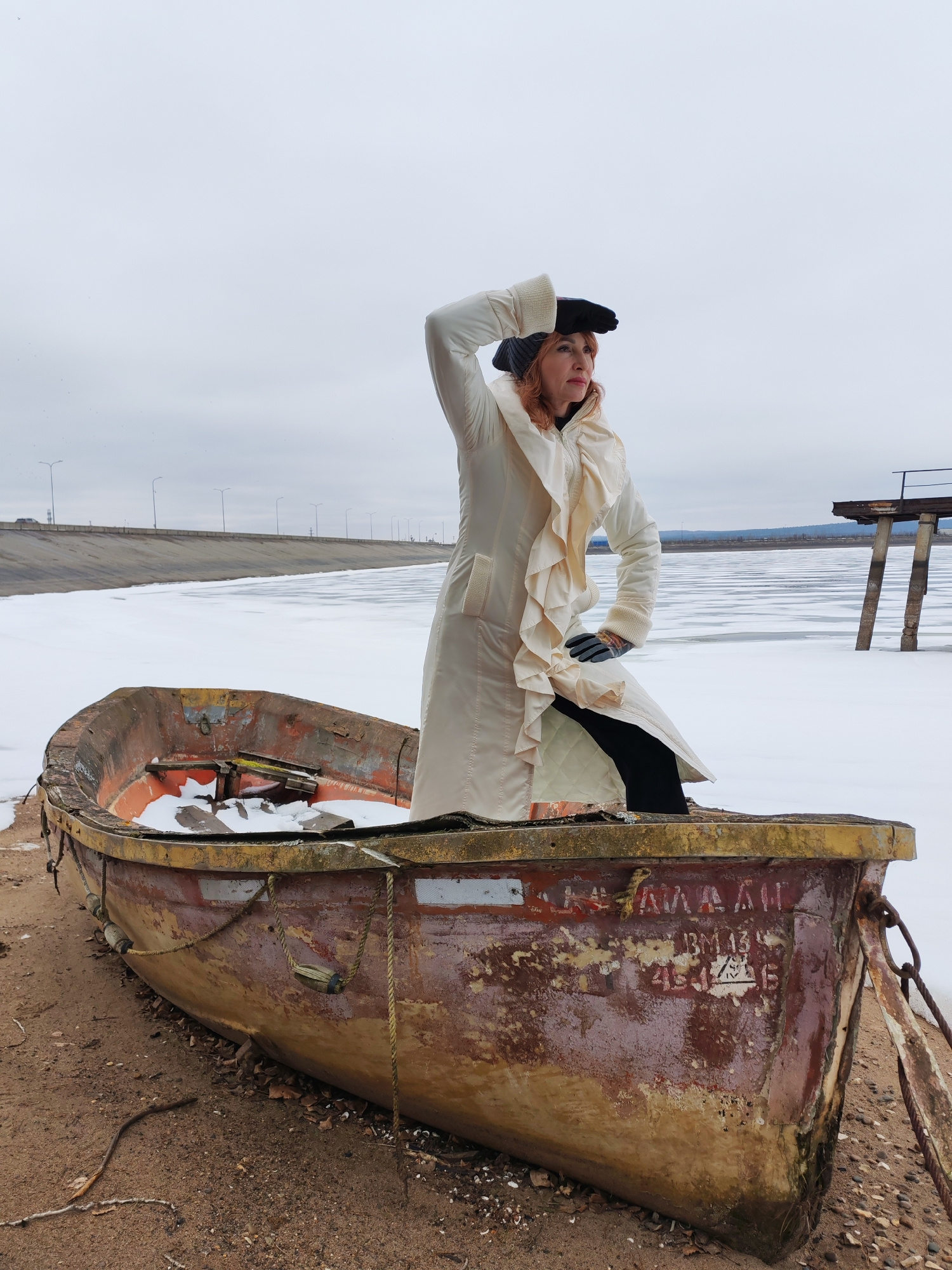 A person stands in an old, weathered rowboat, positioned on a sandy shore in front of a frozen lake or river in the city of Chaikovsky, Russia. The person, possibly female, is wearing a long, light-co…read more