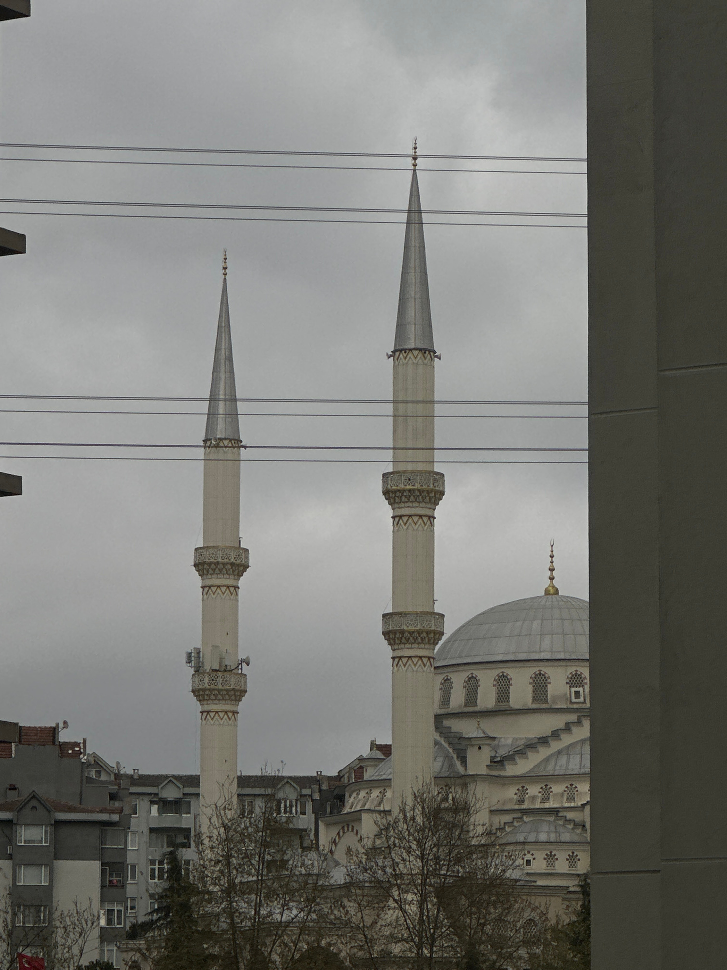 The image depicts a cityscape in Esenyurt, Turkey, featuring two minarets and a dome of a mosque against a cloudy sky. Power lines are visible in the foreground. Buildings are seen in the background,β¦read more