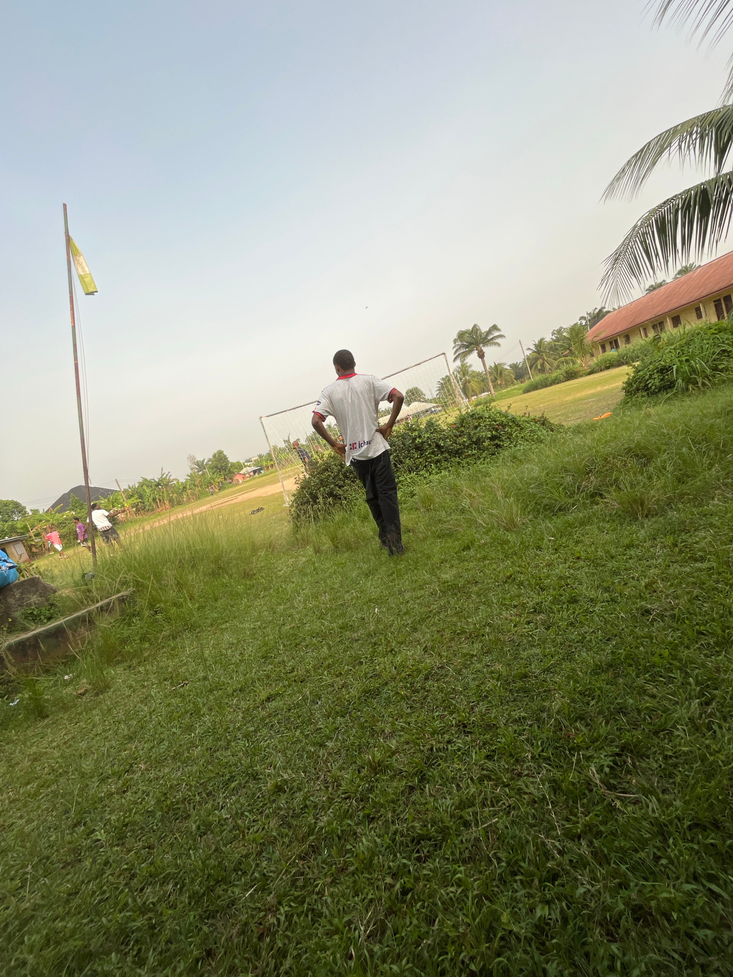 The image depicts a grassy field in Ikot Ekpene, Nigeria, under an overcast sky. A person wearing a white shirt and dark pants stands in the midground. A goalpost is visible in the background, suggest…read more