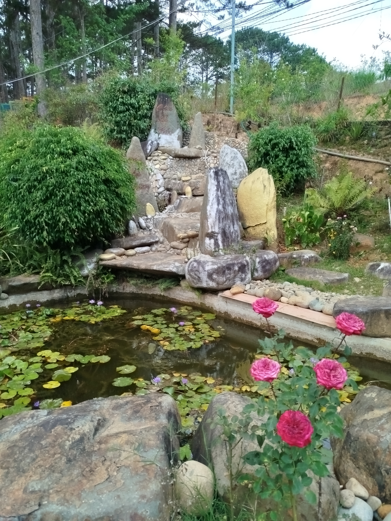 The image depicts a pond in a garden setting, likely located in Đa Thọ, Vietnam. The pond is covered with lily pads and several purple water lilies. A small waterfall feature is constructed of stacked…read more