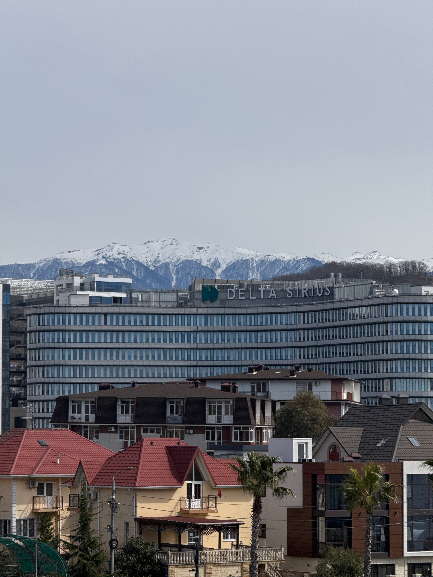 The image shows a cityscape in Sirius, Russia. In the background are snow-covered mountains and an overcast sky. Adjacent to the mountains is a tall, modern building with the words "DELTA SIRIUS" vert…read more